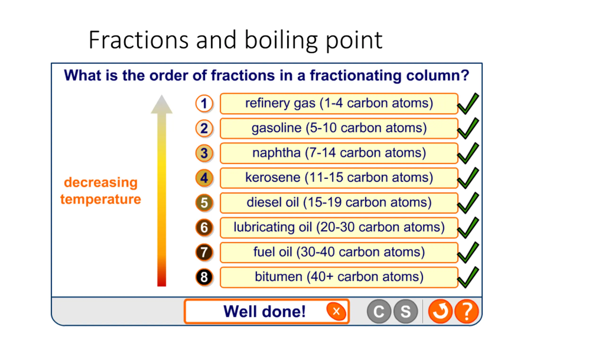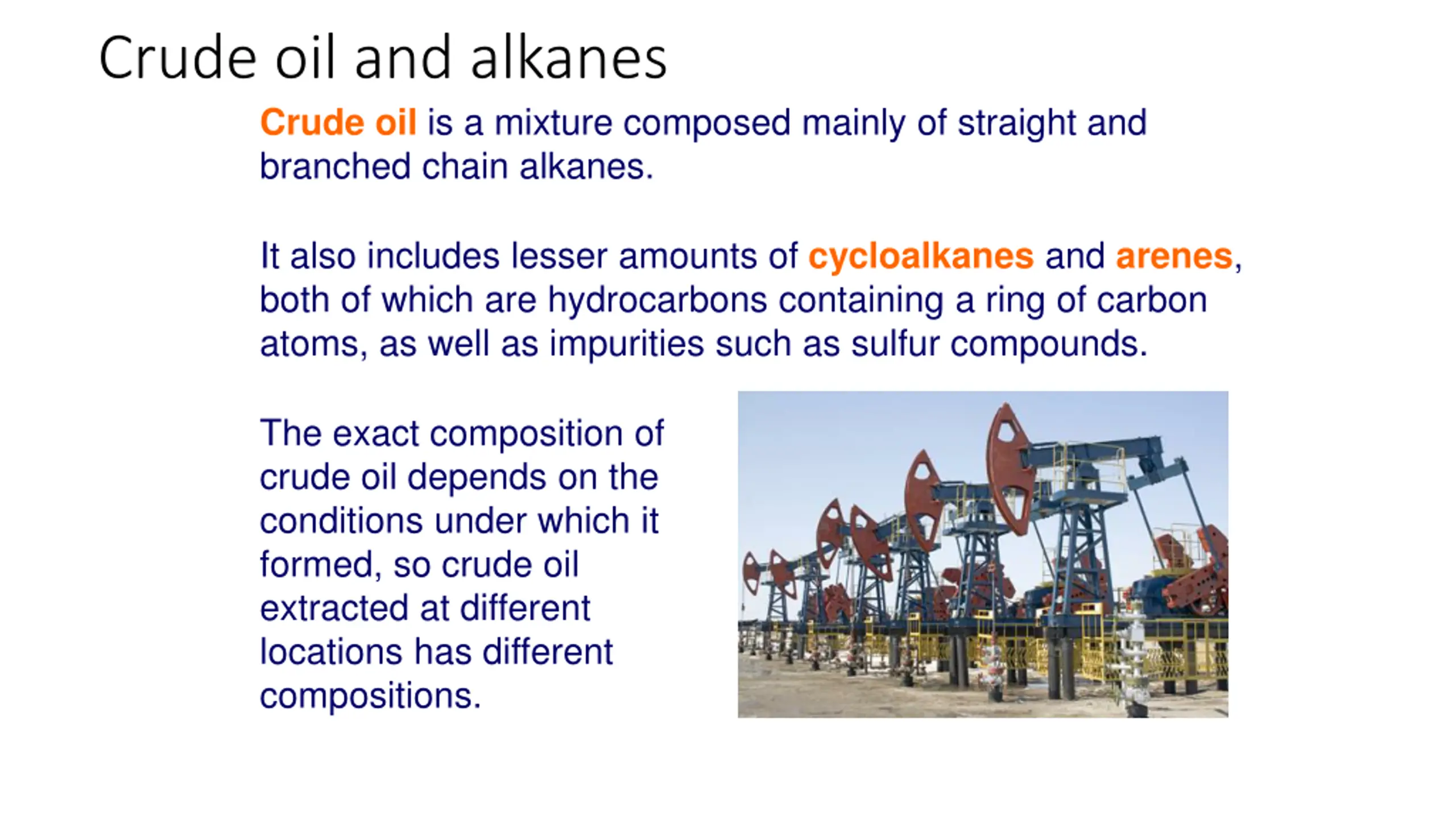 Crude oil and alkanes Crude oil is a mixture composed mainly of straight and branched chain alkanes. It also includes lesser amounts of cycloalkanes and arenes, both of which are hydrocarbons containing a ring of carbon atoms, as well as impurities such as sulfur compounds. The exact composition of crude oil depends on the conditions under which it formed, so crude oil extracted at different locations has different compositions.