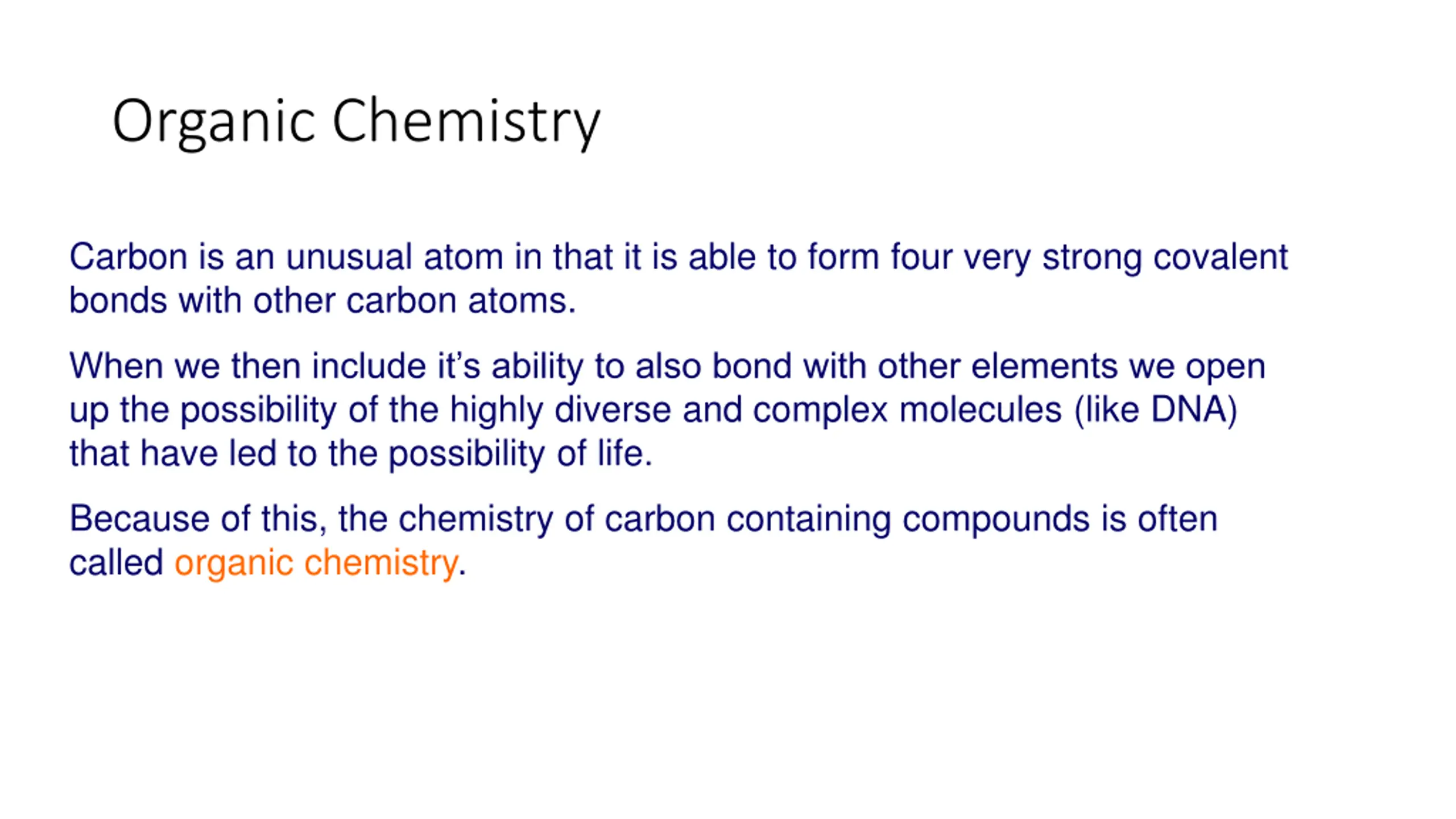Organic Chemistry Carbon is an unusual atom in that it is able to form four very strong covalent bonds with other carbon atoms. When we then include it s ability to also bond with other elements we open up the possibility of the highly diverse and complex molecules (like DNA) that have led to the possibility of life. Because of this, the chemistry of carbon containing compounds is often called organic chemistry.