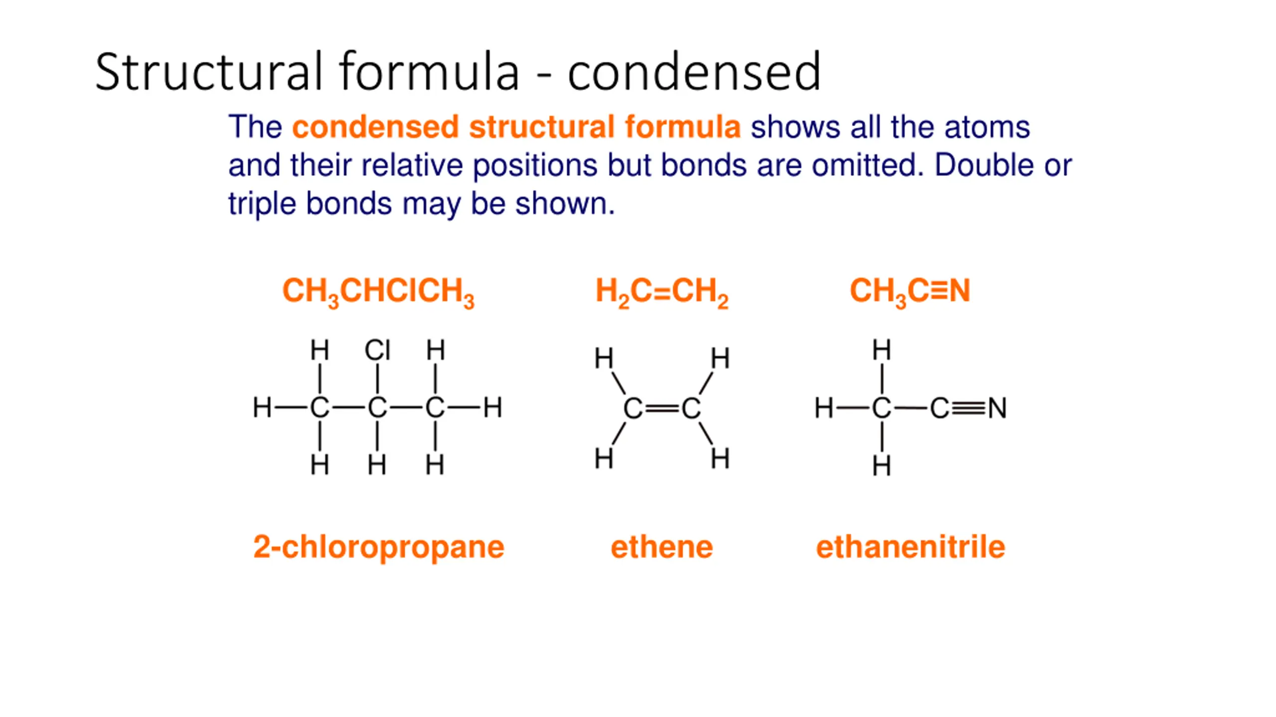 Structural formula - condensed The condensed structural formula shows all the atoms and their relative positions but bonds are omitted. Double or triple bonds may be shown. CH3CHClCH3 H2C=CH2 CH3C N 2-chloropropane ethene ethanenitrile