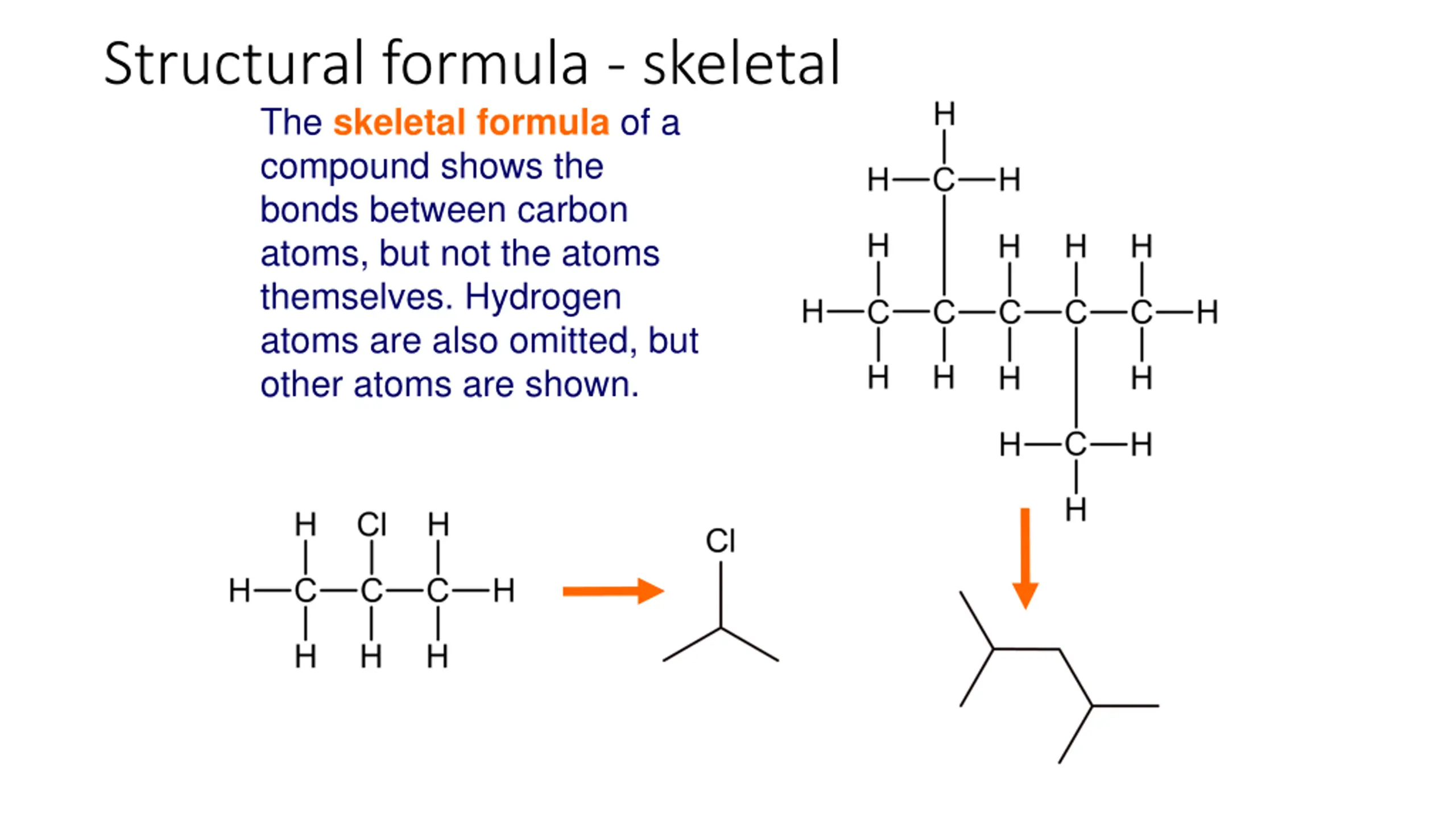 Structural formula - skeletal The skeletal formula of a compound shows the bonds between carbon atoms, but not the atoms themselves. Hydrogen atoms are also omitted, but other atoms are shown.