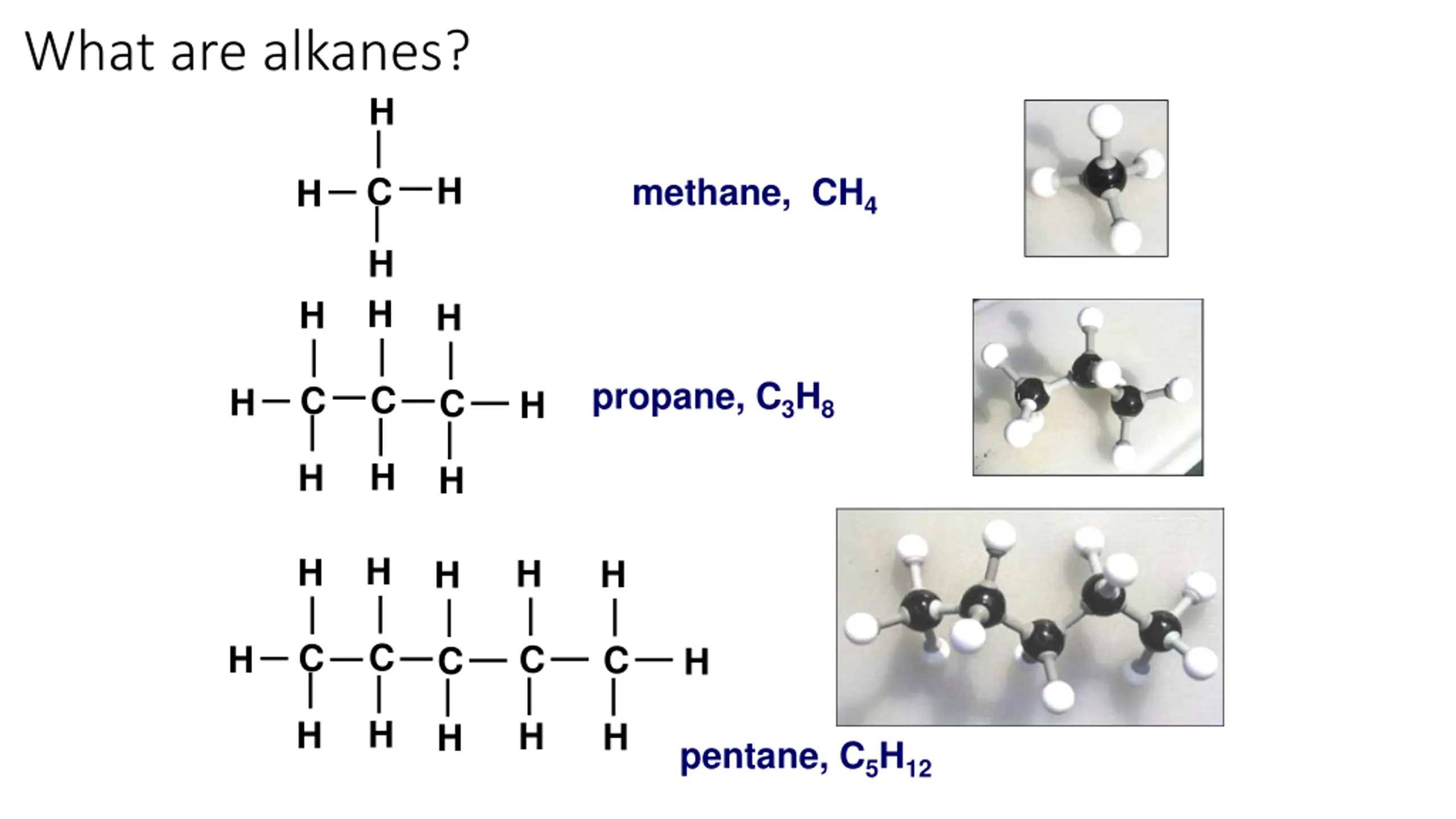 What are alkanes? H H C methane, CH4 H H H H H propane, C3H8 C C H C H H H H H H H H H C C C H C C H H H H H H pentane, C5H12