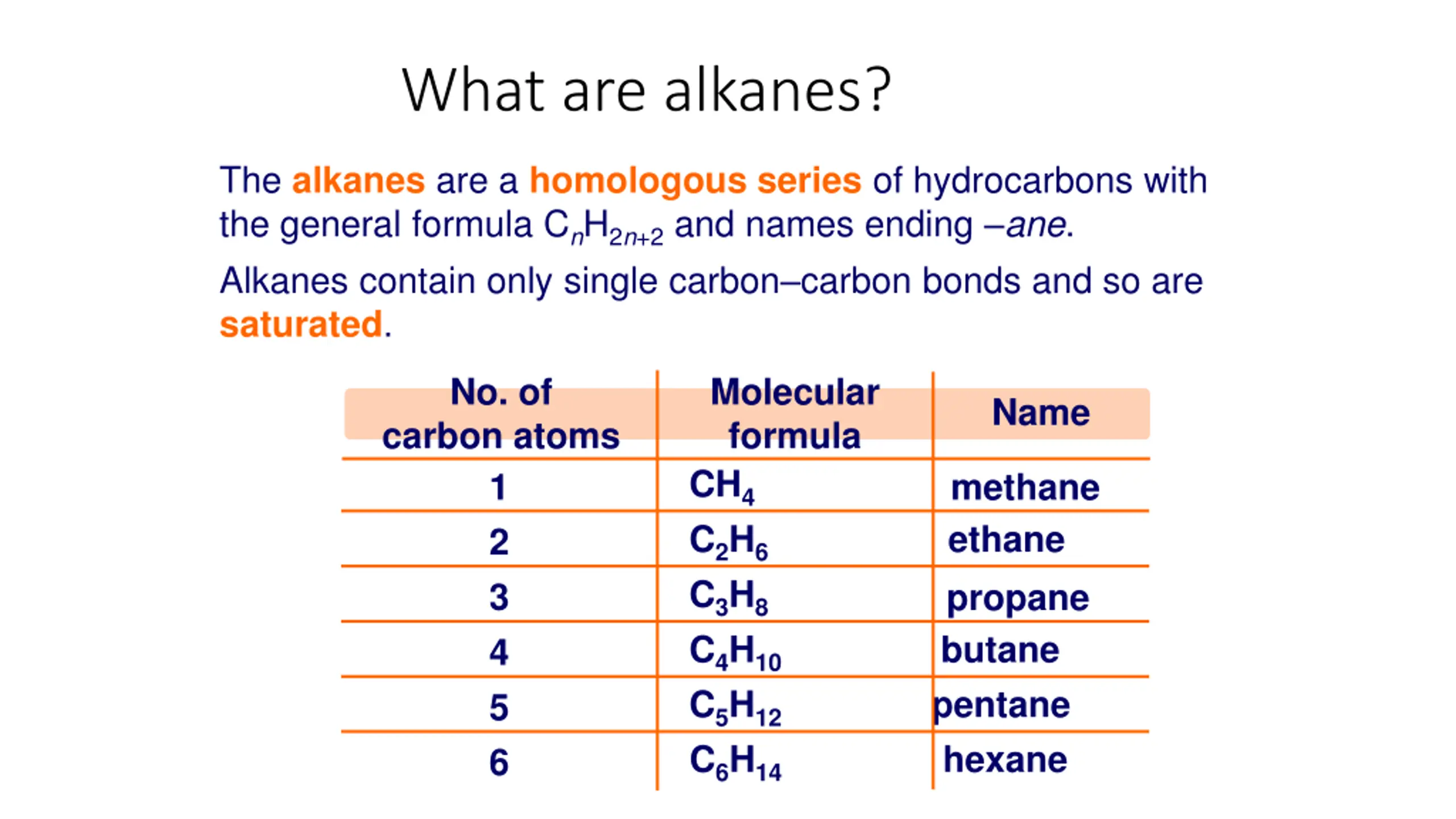 What are alkanes? The alkanes are a homologous series of hydrocarbons with the general formula CnH2n+2 and names ending ane. Alkanes contain only single carbon carbon bonds and so are saturated. No. of Molecular formula Name carbon atoms CH4 1 methane C2H6 ethane 2 C3H8 3 propane C4H10 butane 4 C5H12 C6H14 pentane hexane 5 6