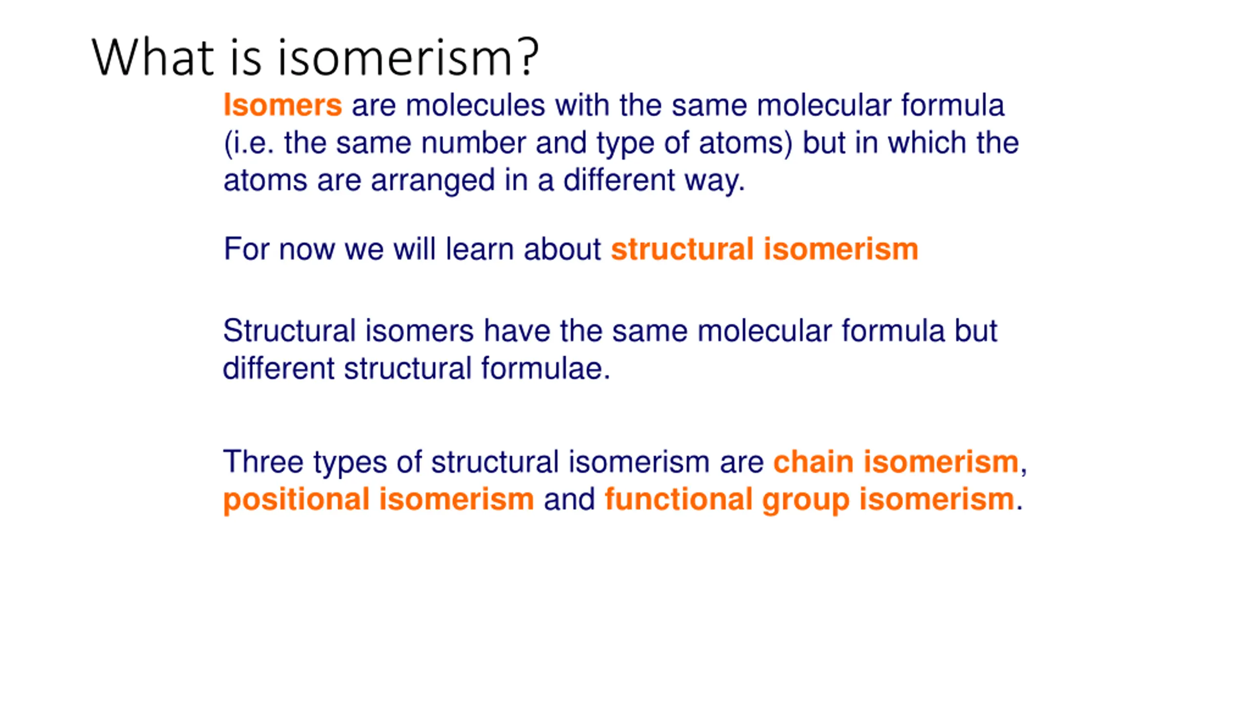 What is isomerism? Isomers are molecules with the same molecular formula (i.e. the same number and type of atoms) but in which the atoms are arranged in a different way. For now we will learn about structural isomerism Structural isomers have the same molecular formula but different structural formulae. Three types of structural isomerism are chain isomerism, positional isomerism and functional group isomerism.