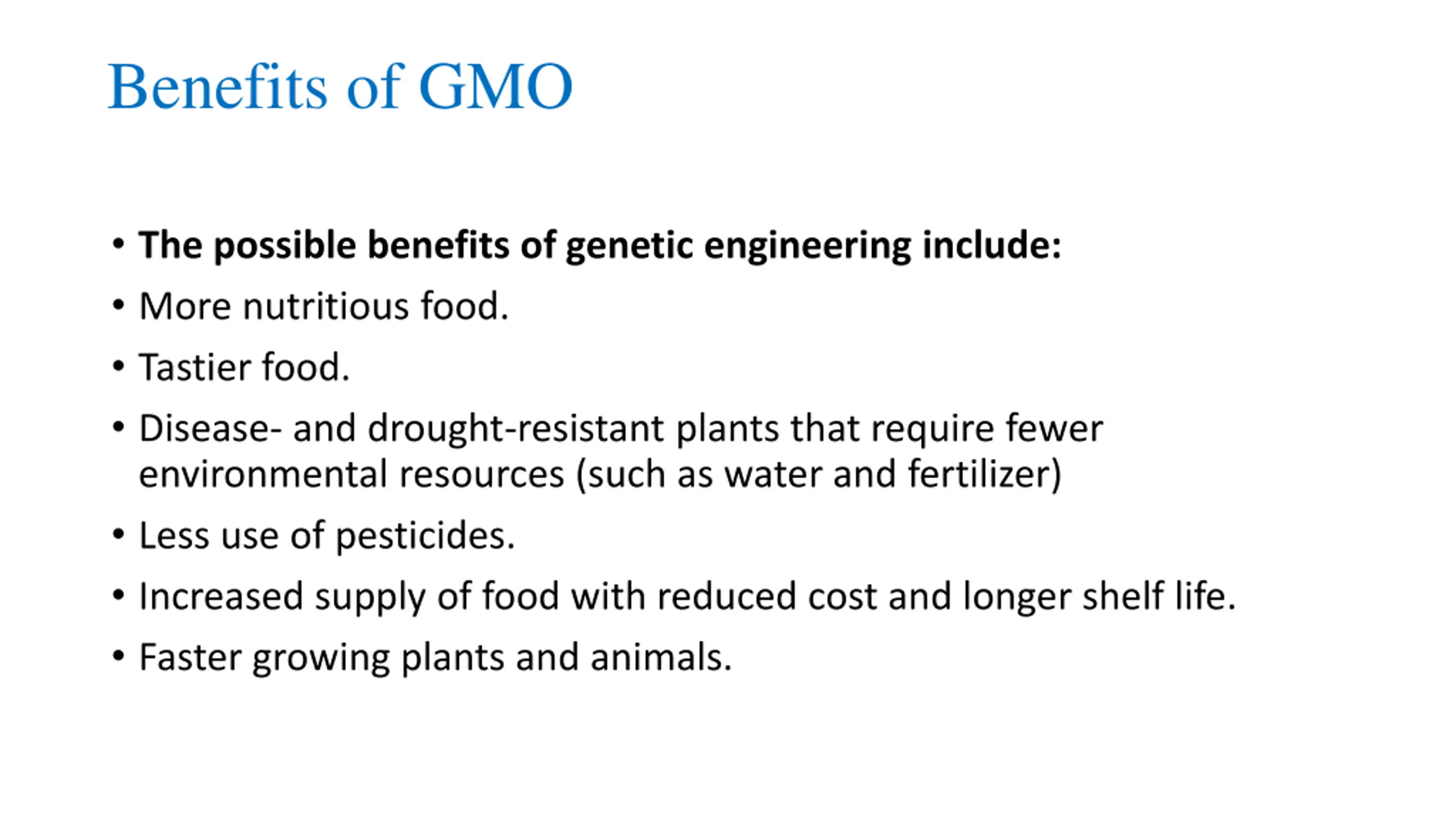Benefits of GMO The possible benefits of genetic engineering include: More nutritious food. Tastier food. Disease- and drought-resistant plants that require fewer environmental resources (such as water and fertilizer) Less use of pesticides. Increased supply of food with reduced cost and longer shelf life. Faster growing plants and animals.