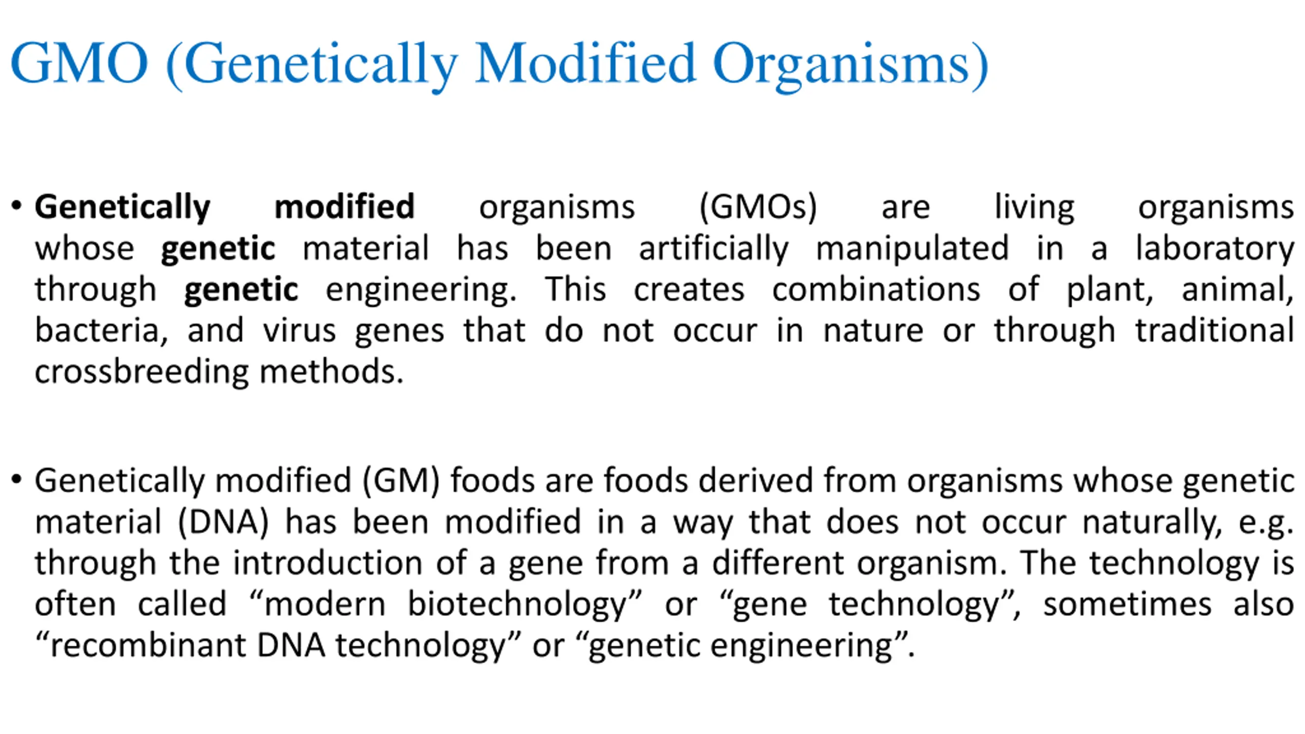 GMO (Genetically Modified Organisms) Genetically whose genetic material has been artificially manipulated in a laboratory through genetic engineering. This creates combinations of plant, animal, bacteria, and virus genes that do not occur in nature or through traditional crossbreeding methods. modified organisms (GMOs) are living organisms Genetically modified (GM) foods are foods derived from organisms whose genetic material (DNA) has been modified in a way that does not occur naturally, e.g. through the introduction of a gene from a different organism. The technology is often called modern biotechnology or gene technology , sometimes also recombinant DNA technology or genetic engineering .
