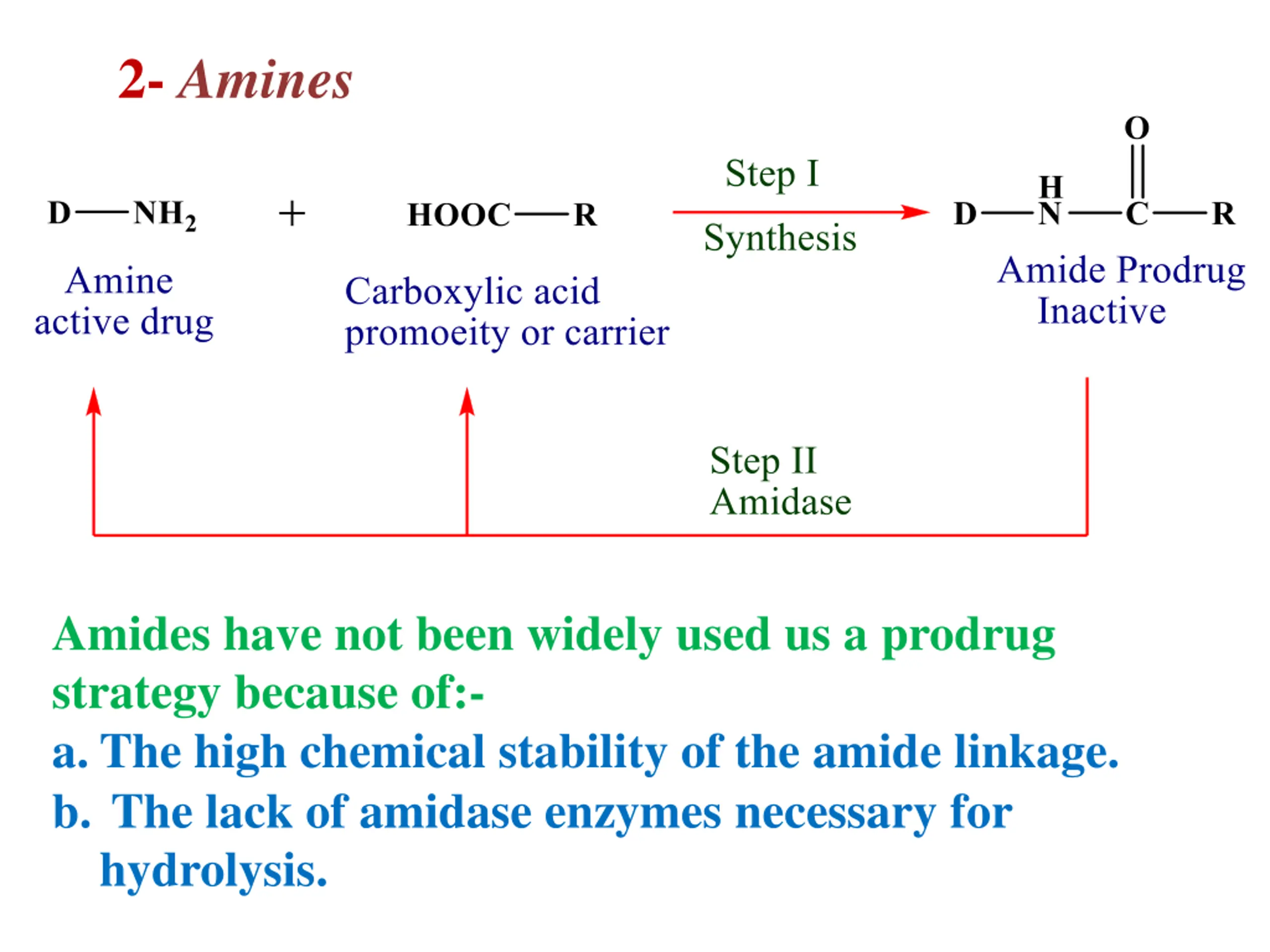 2-Amines Amides have not been widely used us a prodrug strategy because of:- a. The high chemical stability of the amide linkage. b. The lack of amidase enzymes necessary for hydrolysis.