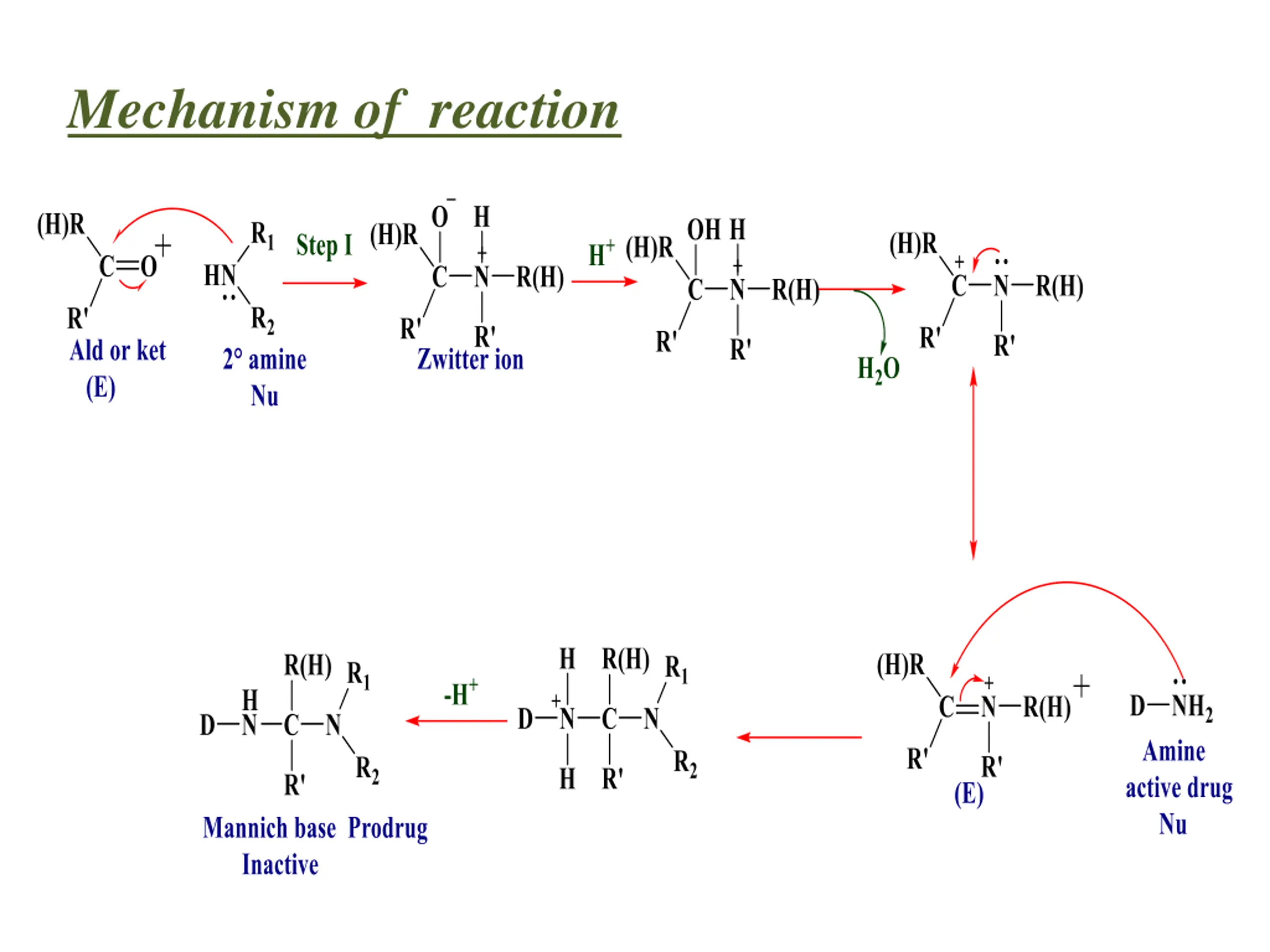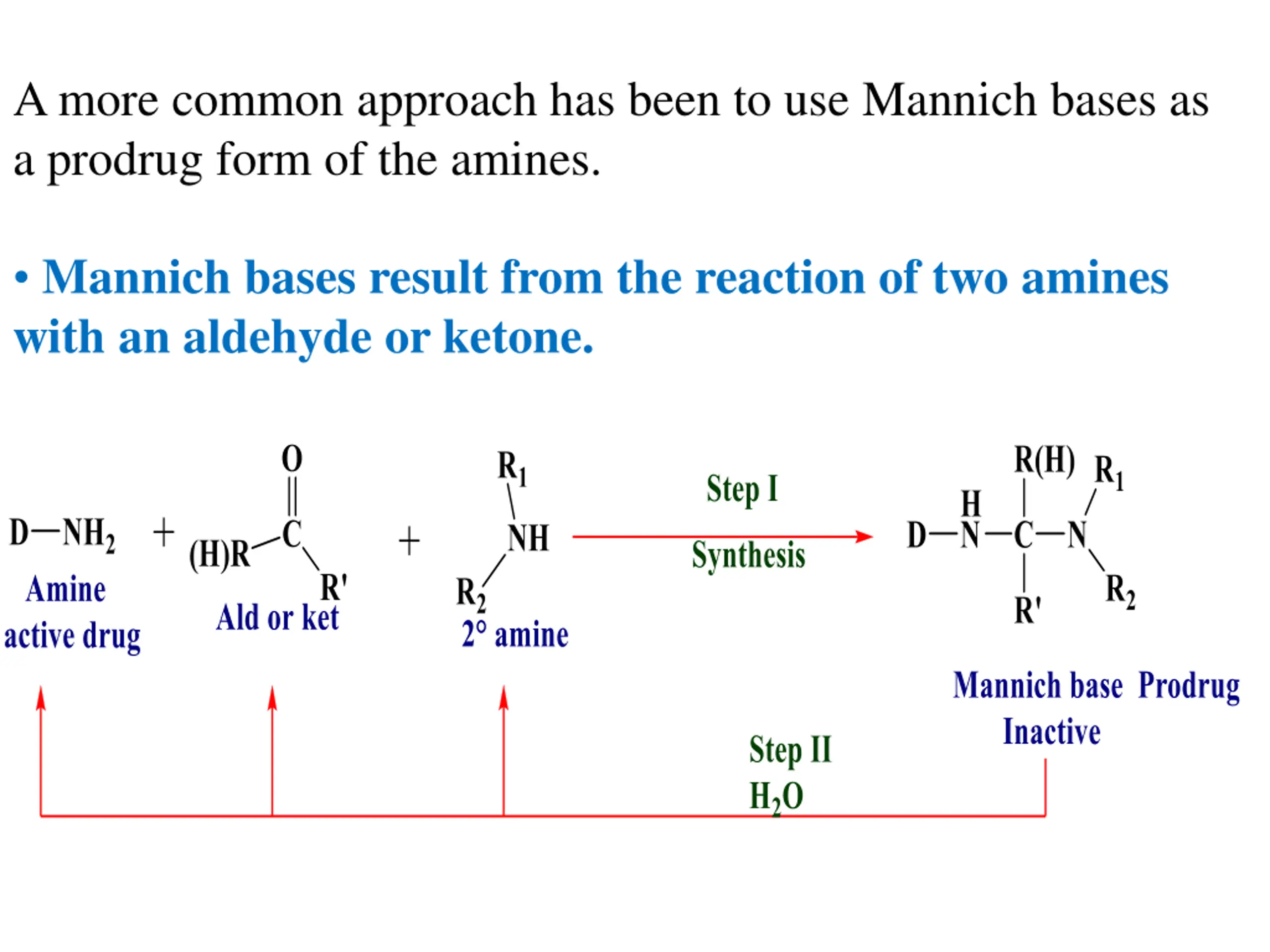 A more common approach has been to use Mannich bases as a prodrug form of the amines. Mannich bases result from the reaction of two amines with an aldehyde or ketone.