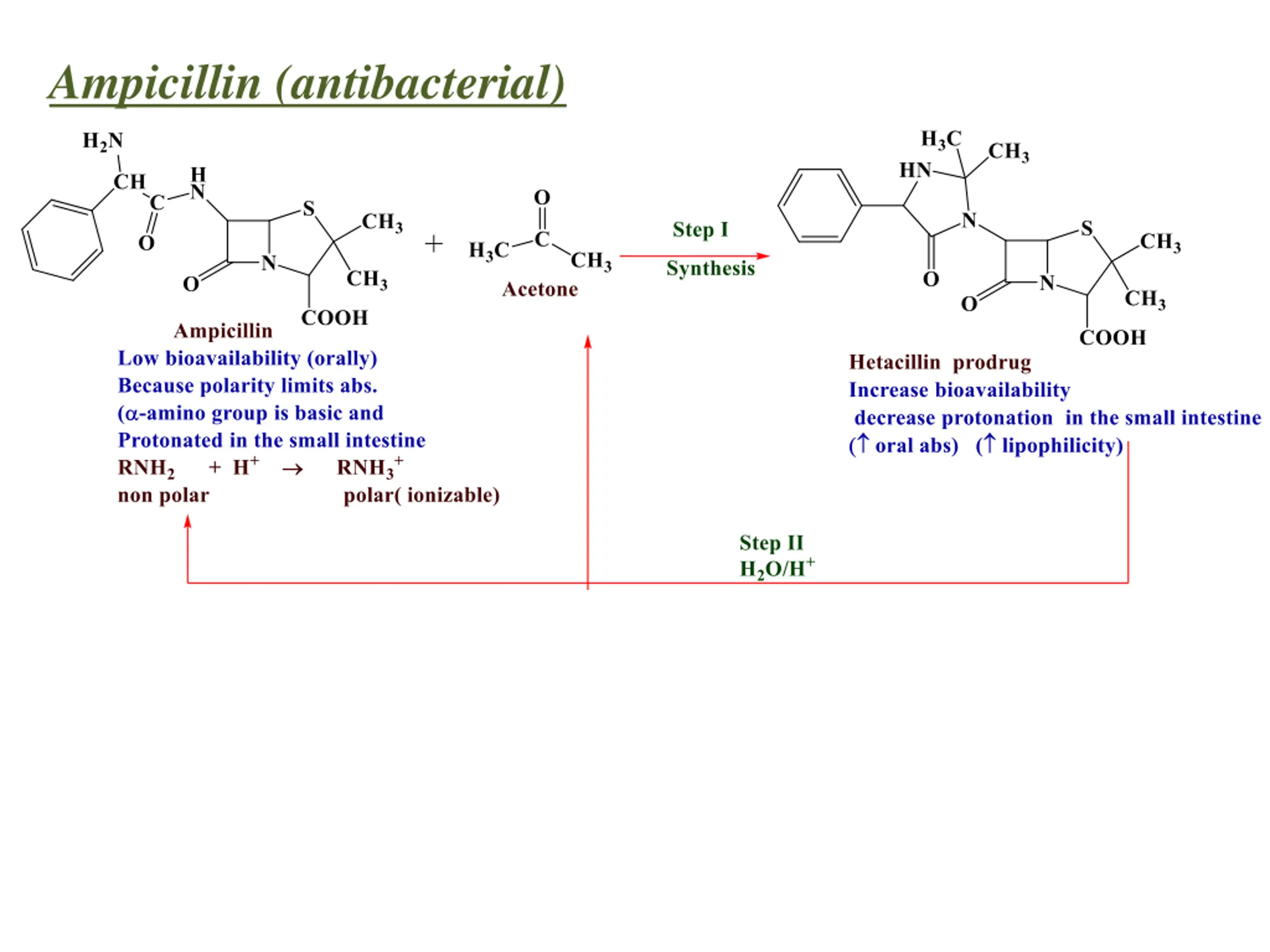 Hetacillin is a prodrug form of ampicillin in which the amide nitrogen and -amino functionalities have been allowed to react with acetone to give an imidazolidinone ring system. This decreases the basicity of the -amino group and reduces protonation in the small intestine so that the agent is more lipophilic. In this manner, the absorption of the drug from the small intestine is increased after oral dosing, and chemical hydrolysis after absorption regenerates ampicillin.