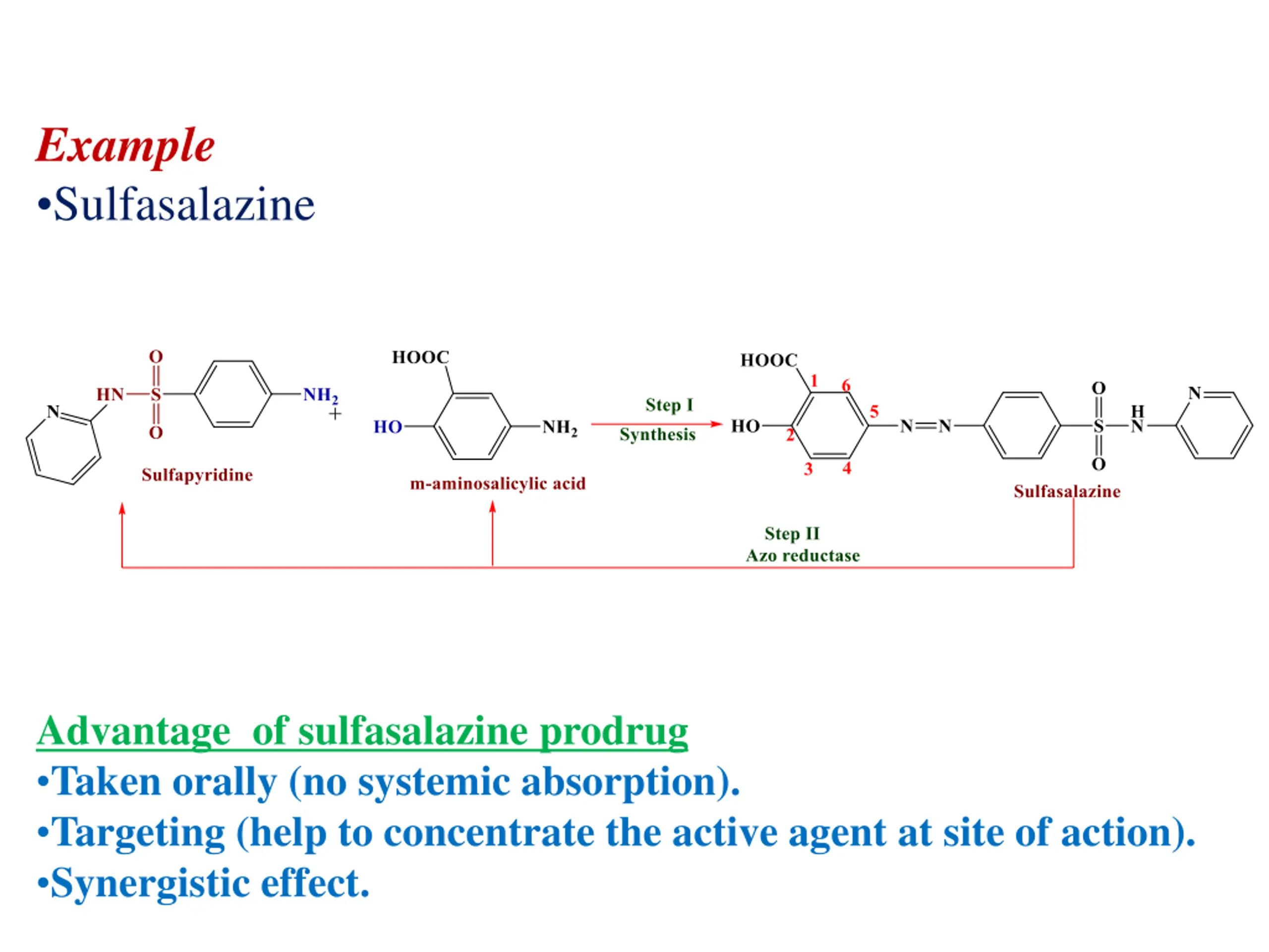 Example Sulfasalazine Advantage of sulfasalazine prodrug Taken orally (no systemic absorption). Targeting (help to concentrate the active agent at site of action). Synergistic effect.