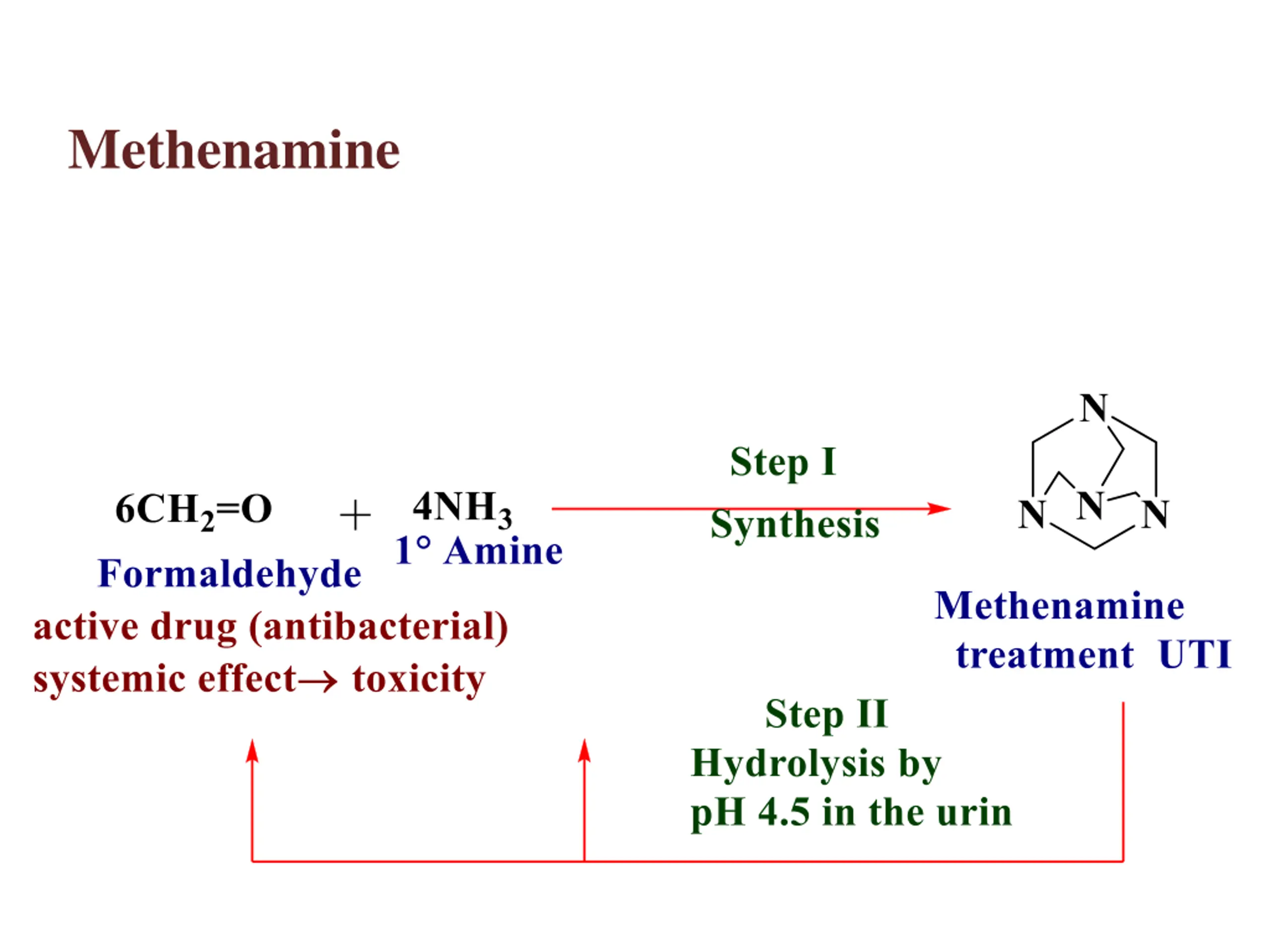 Methenamine is only hydrolyse in acidic media which is found in acidic urine leading to liberation of formaldehyde and 4NH3,where the formaldehyde act as antibacterial agent by reacting with nucleophiles present in bacteria. The agent is administered in enteric-coated capsules to protect it from premature hydrolysis in the acidic environment of the stomach. After dissolution of the enteric-coated capsules in the intestine, the agent is absorbed and moves into the bloodstream, eventually ending up in the urine, where the acidic pH catalyzes the chemical hydrolysis to give formaldehyde. Use of this prodrug approach prevents the systemic release of formaldehyde and reduces toxicity.