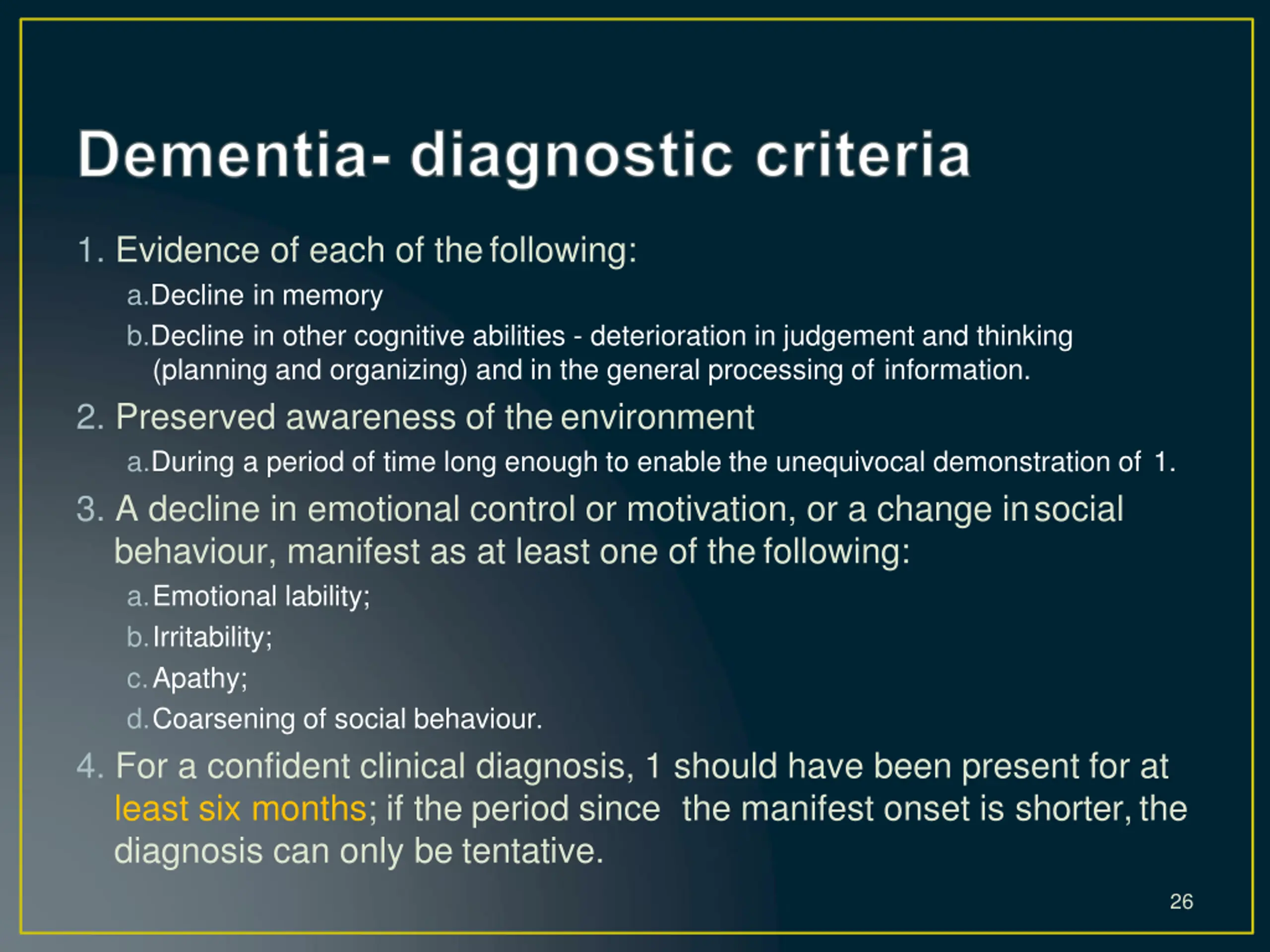 1. Evidence of each of thefollowing: a.Decline in memory b.Decline in other cognitive abilities - deterioration in judgement and thinking (planning and organizing) and in the general processing of information. 2. Preserved awareness of theenvironment a.During a period of time long enough to enable the unequivocal demonstration of 1. 3. A decline in emotional control or motivation, or a change insocial behaviour, manifest as at least one of thefollowing: a.Emotional lability; b.Irritability; c.Apathy; d.Coarsening of social behaviour. 4. For a confident clinical diagnosis, 1 should have been present for at least six months; if the period since the manifest onset is shorter,the diagnosis can only be tentative. 26