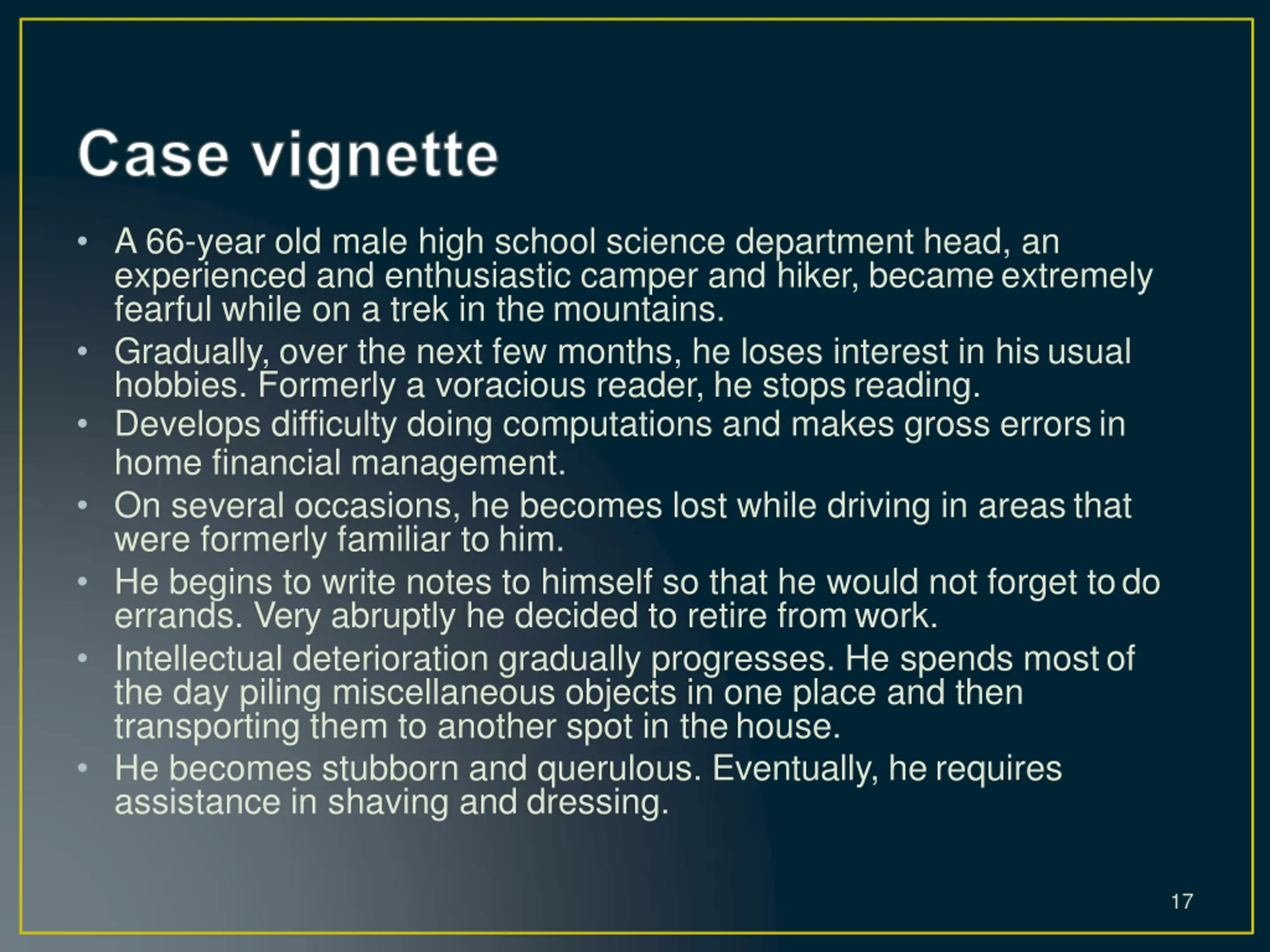 A 66-year old male high school science department head, an experienced and enthusiastic camper and hiker, becameextremely fearful while on a trek in the mountains. Gradually, over the next few months, he loses interest in hisusual hobbies. Formerly a voracious reader, he stopsreading. Develops difficulty doing computations and makes gross errorsin home financial management. On several occasions, he becomes lost while driving in areasthat were formerly familiar to him. He begins to write notes to himself so that he would not forget todo errands. Very abruptly he decided to retire fromwork. Intellectual deterioration gradually progresses. He spends mostof the day piling miscellaneous objects in one place and then transporting them to another spot in thehouse. He becomes stubborn and querulous. Eventually, he requires assistance in shaving and dressing. 17