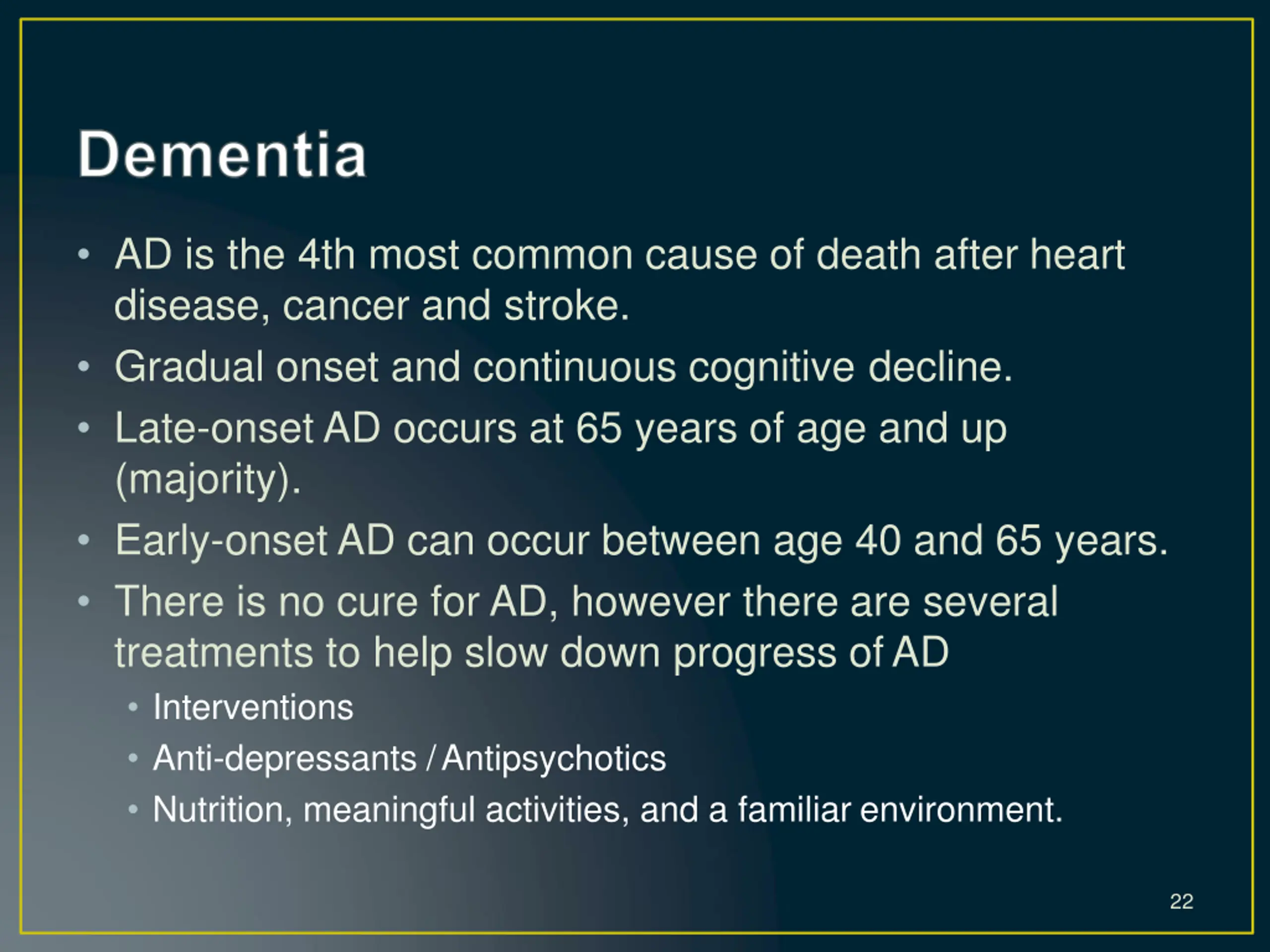 AD is the 4th most common cause of death after heart disease, cancer and stroke. Gradual onset and continuous cognitive decline. Late-onset AD occurs at 65 years of age and up (majority). Early-onset AD can occur between age 40 and 65 years. There is no cure for AD, however there are several treatments to help slow down progress ofAD Interventions Anti-depressants /Antipsychotics Nutrition, meaningful activities, and a familiar environment. 22
