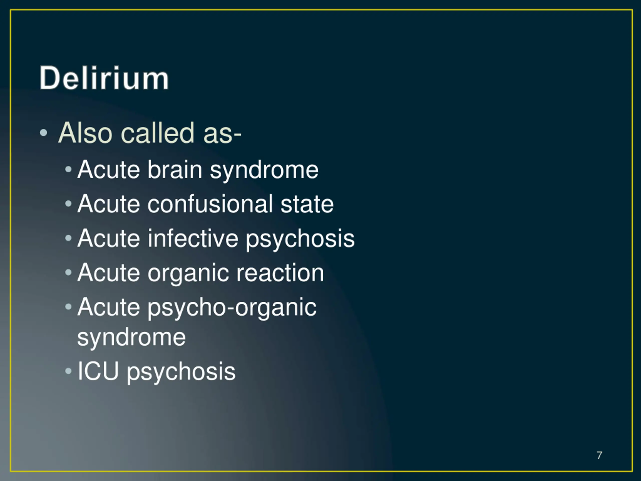 Also called as- Acute brain syndrome Acute confusional state Acute infective psychosis Acute organic reaction Acute psycho-organic syndrome ICU psychosis 7