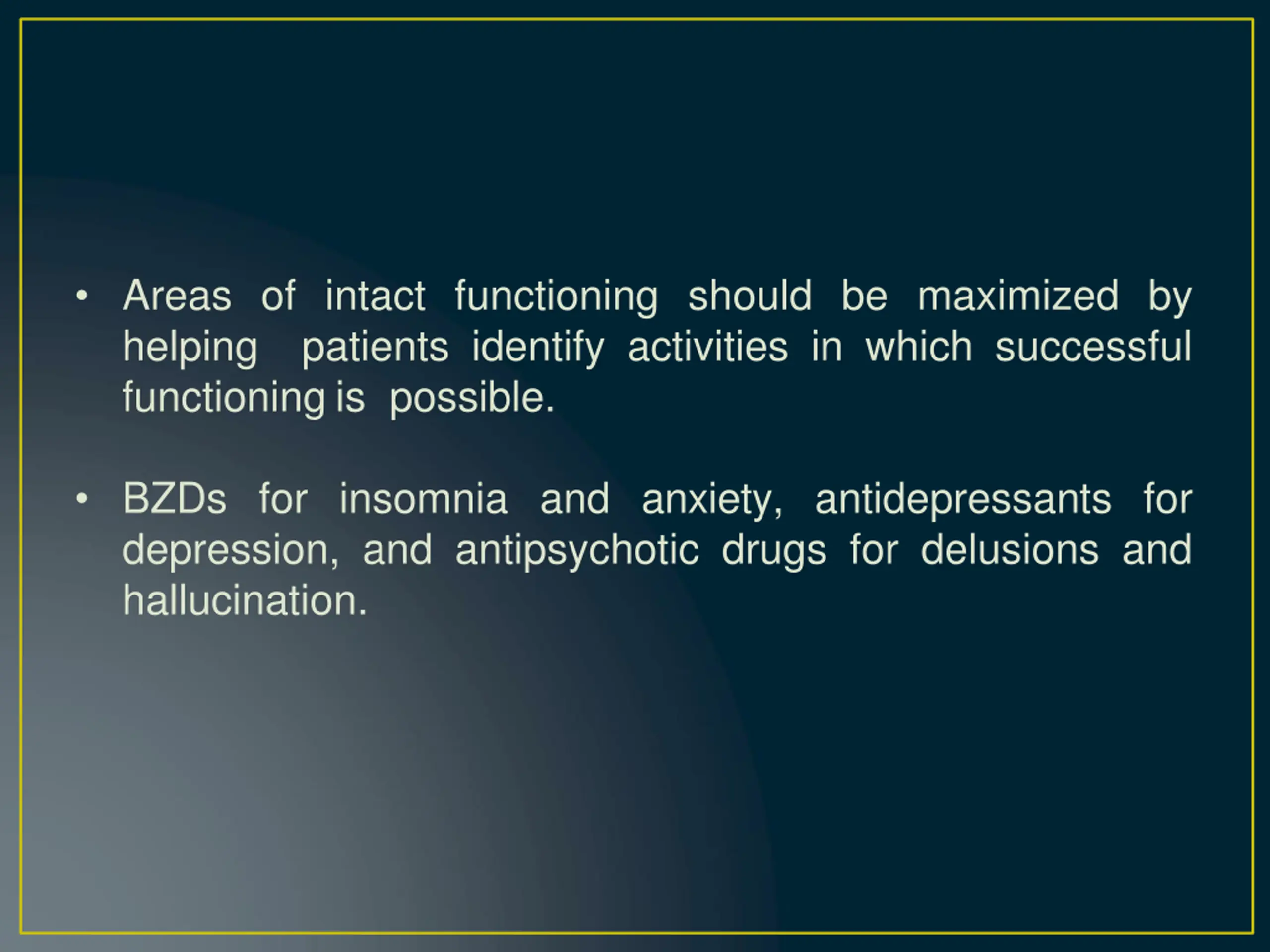 Areas of intact functioning should be maximized by helping patients identify activities in which successful functioning is possible. BZDs for insomnia and anxiety, antidepressants for depression, and antipsychotic drugs for delusions and hallucination.