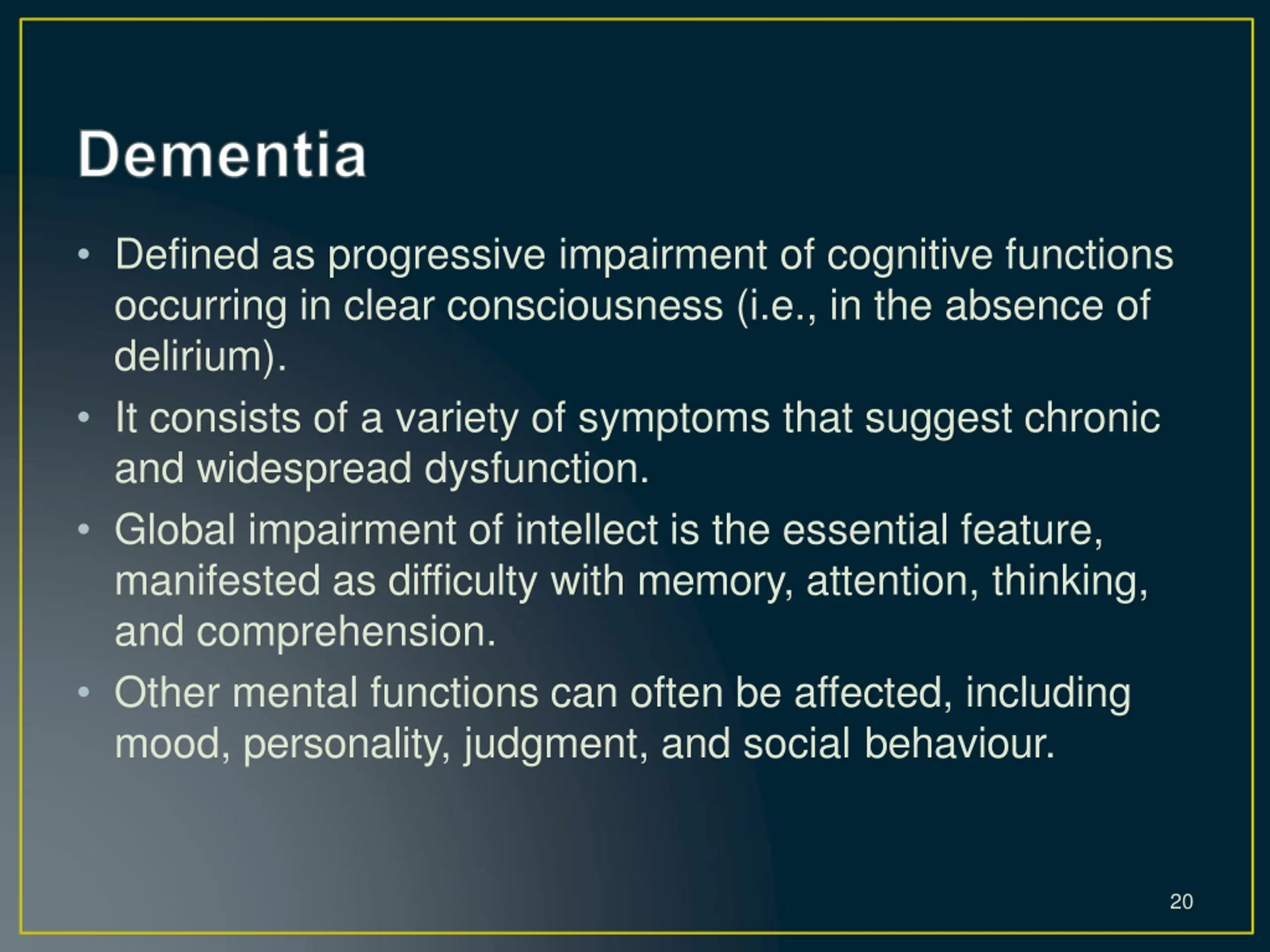 Defined as progressive impairment of cognitive functions occurring in clear consciousness (i.e., in the absence of delirium). It consists of a variety of symptoms that suggest chronic and widespread dysfunction. Global impairment of intellect is the essential feature, manifested as difficulty with memory, attention, thinking, and comprehension. Other mental functions can often be affected, including mood, personality, judgment, and social behaviour. 20