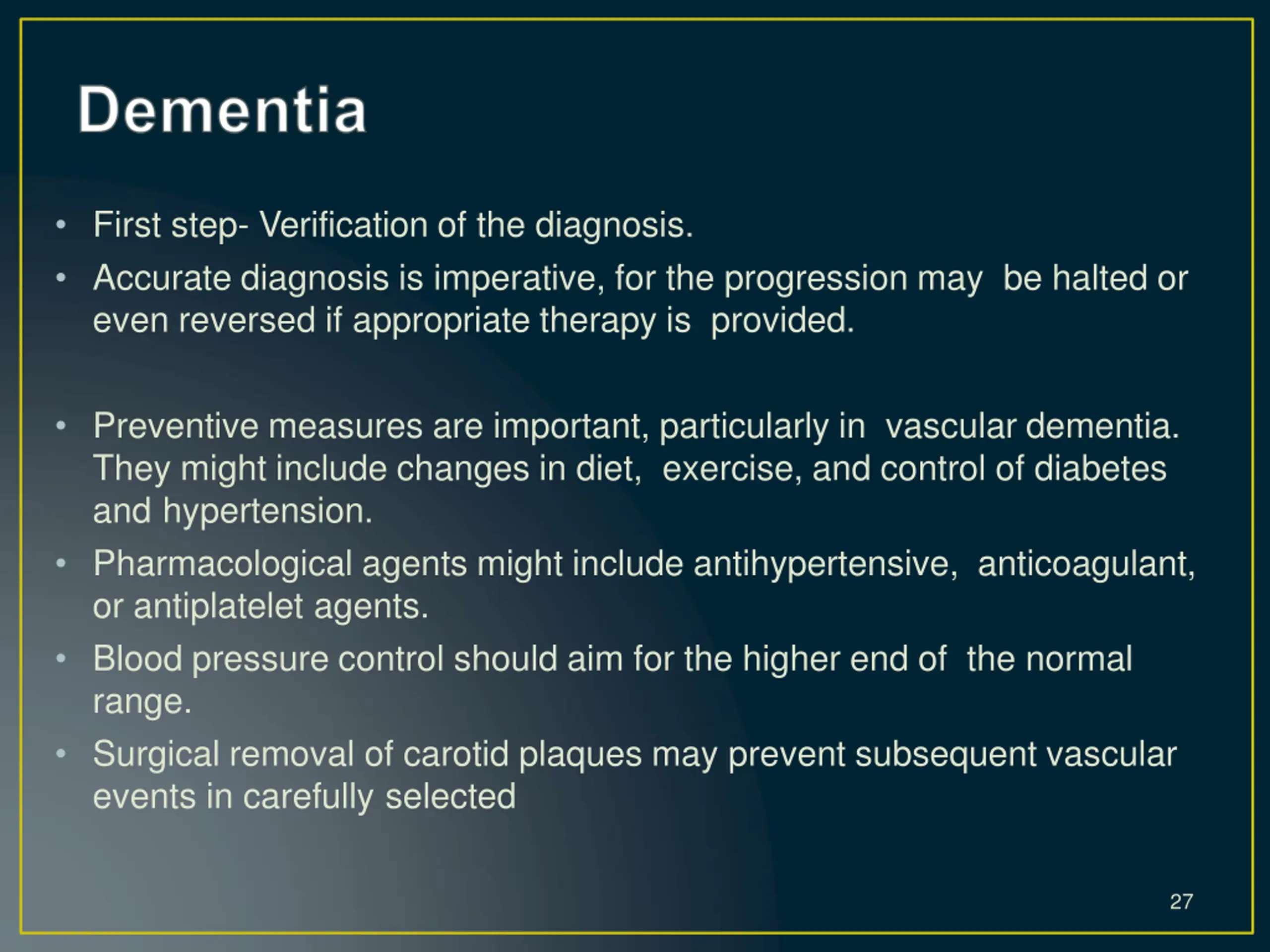 First step- Verification of the diagnosis. Accurate diagnosis is imperative, for the progression may be halted or even reversed if appropriate therapy is provided. Preventive measures are important, particularly in vascular dementia. They might include changes in diet, exercise, and control of diabetes and hypertension. Pharmacological agents might include antihypertensive, anticoagulant, or antiplatelet agents. Blood pressure control should aim for the higher end of the normal range. Surgical removal of carotid plaques may prevent subsequent vascular events in carefully selected 27