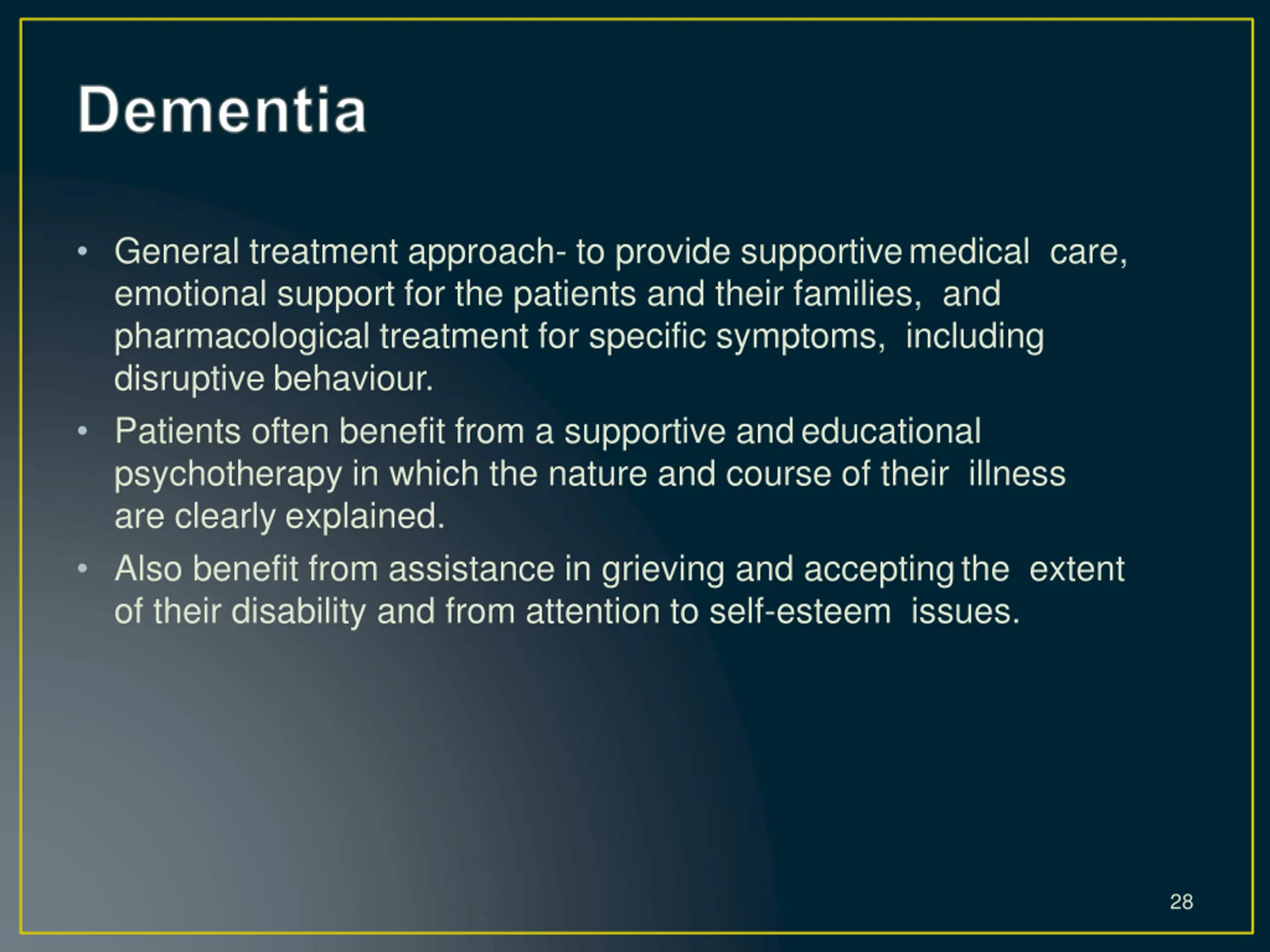 General treatment approach- to provide supportivemedical care, emotional support for the patients and their families, and pharmacological treatment for specific symptoms, including disruptive behaviour. Patients often benefit from a supportive andeducational psychotherapy in which the nature and course of their illness are clearly explained. Also benefit from assistance in grieving and acceptingthe extent of their disability and from attention to self-esteem issues. 28
