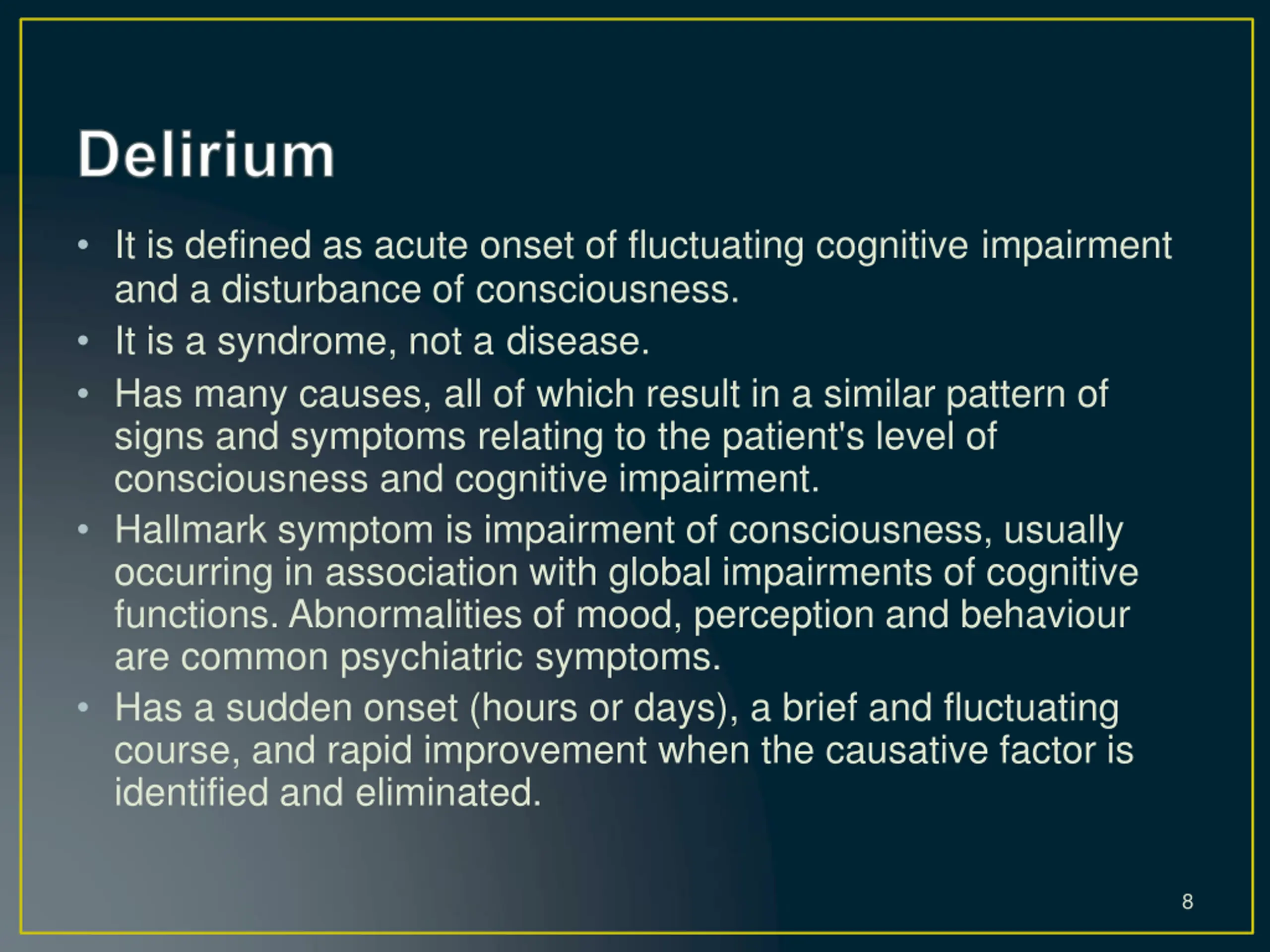 It is defined as acute onset of fluctuating cognitive impairment and a disturbance of consciousness. It is a syndrome, not a disease. Has many causes, all of which result in a similar pattern of signs and symptoms relating to the patient's level of consciousness and cognitive impairment. Hallmark symptom is impairment of consciousness, usually occurring in association with global impairments of cognitive functions. Abnormalities of mood, perception and behaviour are common psychiatric symptoms. Has a sudden onset (hours or days), a brief and fluctuating course, and rapid improvement when the causative factor is identified and eliminated. 8