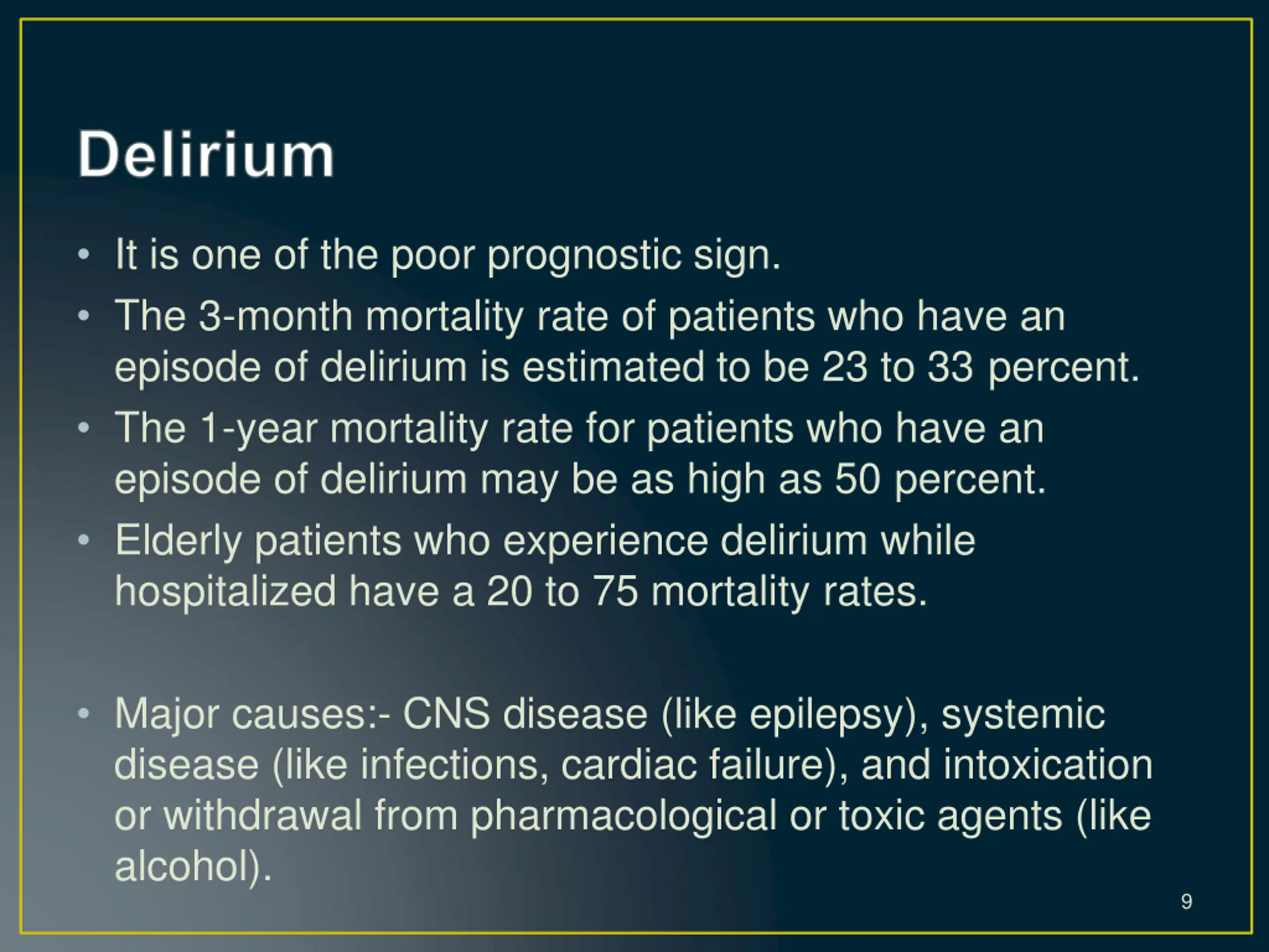 It is one of the poor prognostic sign. The 3-month mortality rate of patients who have an episode of delirium is estimated to be 23 to 33 percent. The 1-year mortality rate for patients who have an episode of delirium may be as high as 50 percent. Elderly patients who experience delirium while hospitalized have a 20 to 75 mortality rates. Major causes:- CNS disease (like epilepsy), systemic disease (like infections, cardiac failure), and intoxication or withdrawal from pharmacological or toxic agents (like alcohol). 9