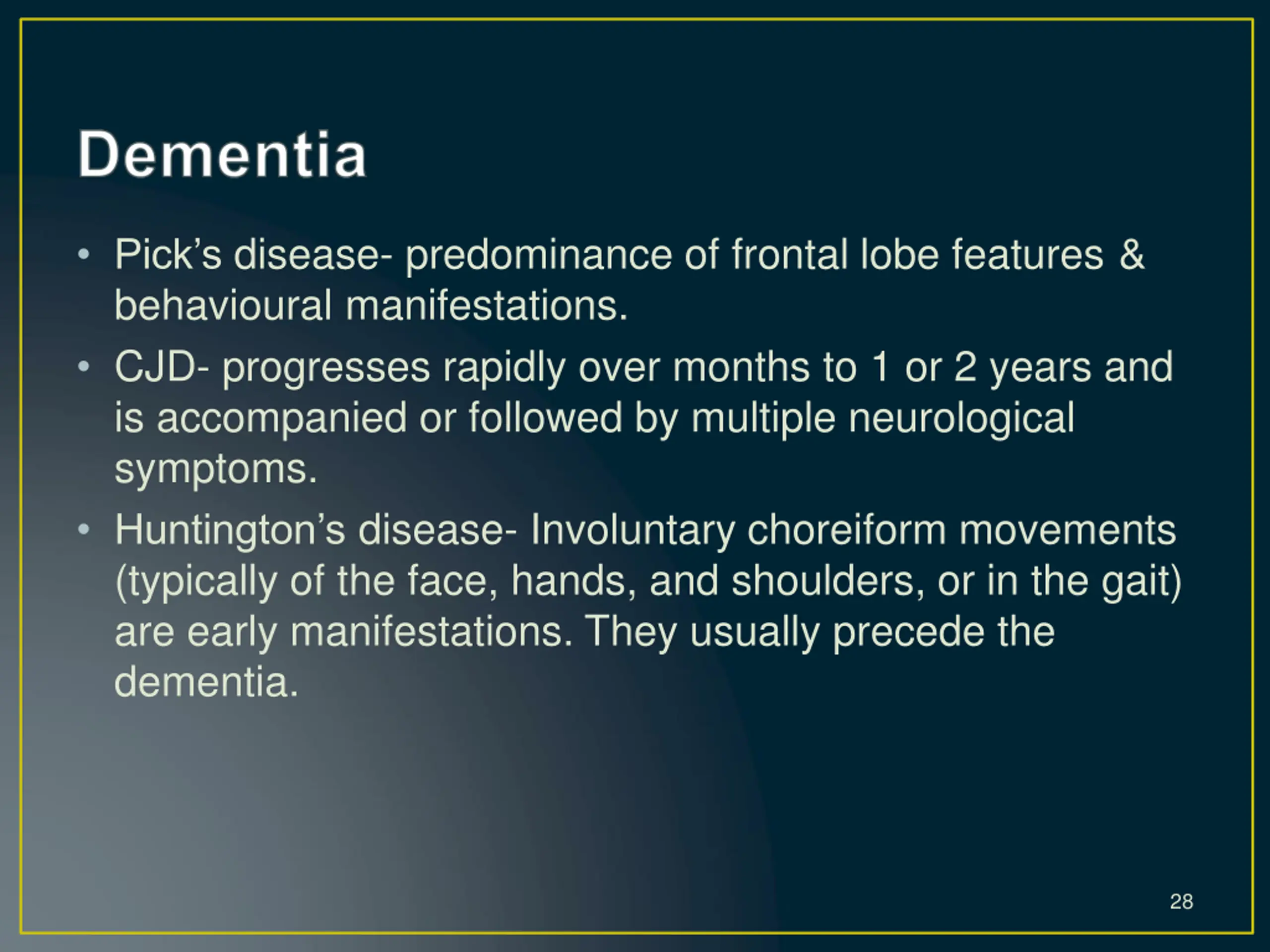 Picks disease- predominance of frontal lobe features & behavioural manifestations. CJD- progresses rapidly over months to 1 or 2 years and is accompanied or followed by multiple neurological symptoms. Huntington s disease- Involuntary choreiform movements (typically of the face, hands, and shoulders, or in the gait) are early manifestations. They usually precede the dementia. 28