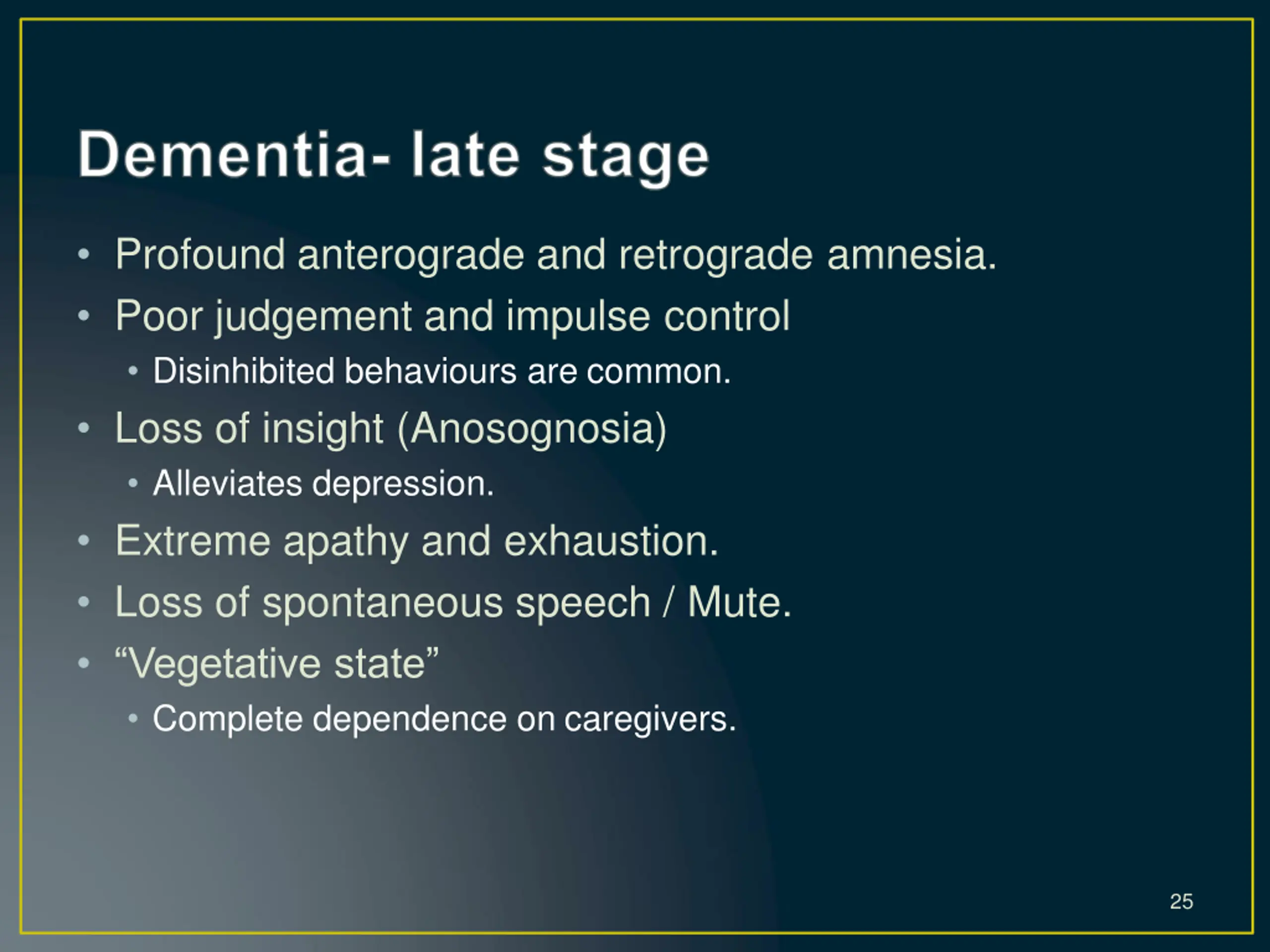 Profound anterograde and retrograde amnesia. Poor judgement and impulse control Disinhibited behaviours are common. Loss of insight (Anosognosia) Alleviates depression. Extreme apathy and exhaustion. Loss of spontaneous speech / Mute. Vegetative state Complete dependence on caregivers. 25