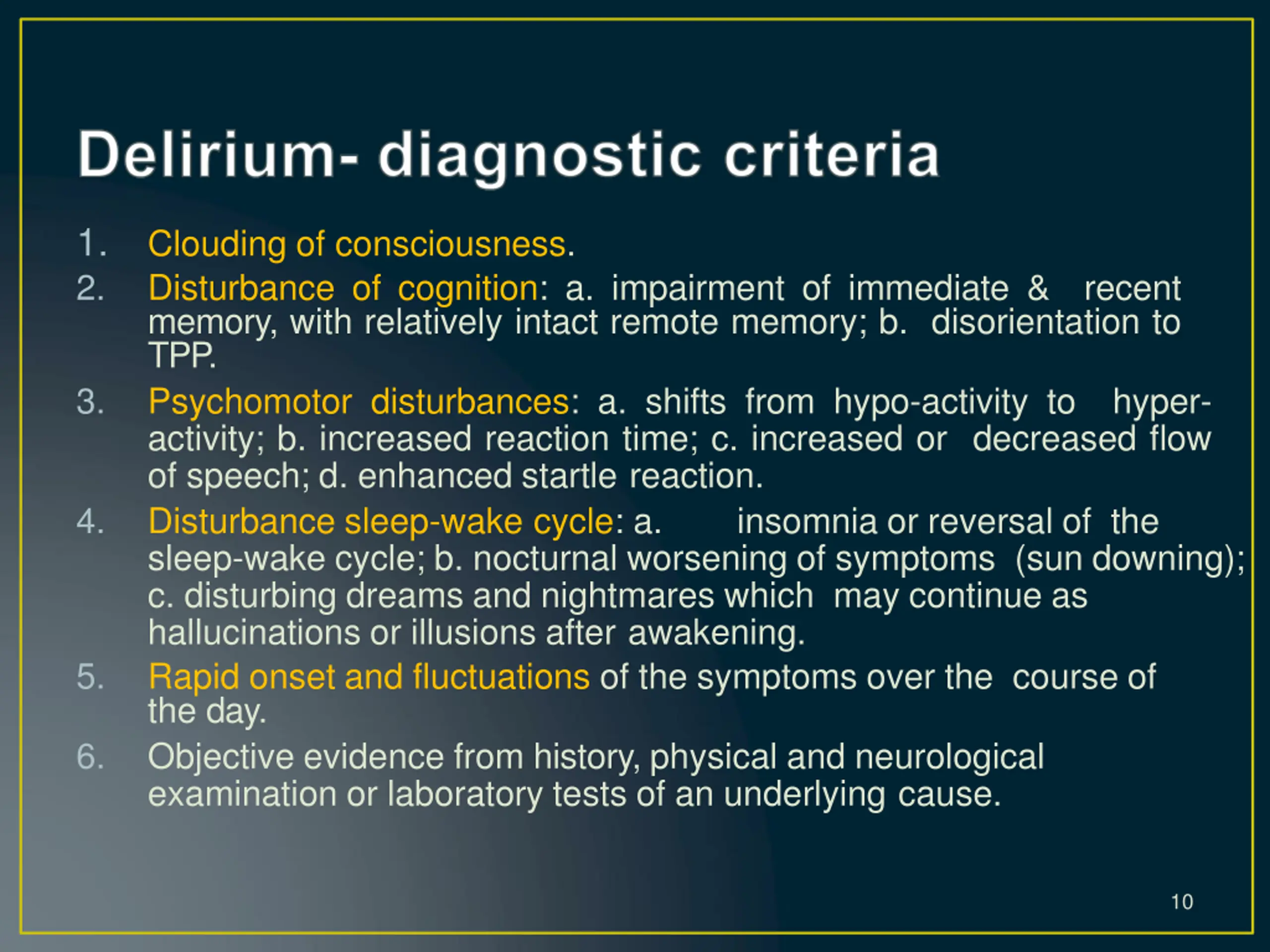 1. 2. Clouding of consciousness. Disturbance of cognition: a. impairment of immediate & memory, with relatively intact remote memory; b. disorientation to TPP. Psychomotor disturbances: a. shifts from hypo-activity to activity; b. increased reaction time; c. increased or decreased flow of speech; d. enhanced startle reaction. Disturbance sleep-wake cycle: a. sleep-wake cycle; b. nocturnal worsening of symptoms (sun downing); c. disturbing dreams and nightmares which may continue as hallucinations or illusions after awakening. Rapid onset and fluctuations of the symptoms over the course of the day. Objective evidence from history, physical and neurological examination or laboratory tests of an underlying cause. recent 3. hyper- 4. insomnia or reversal of the 5. 6. 10