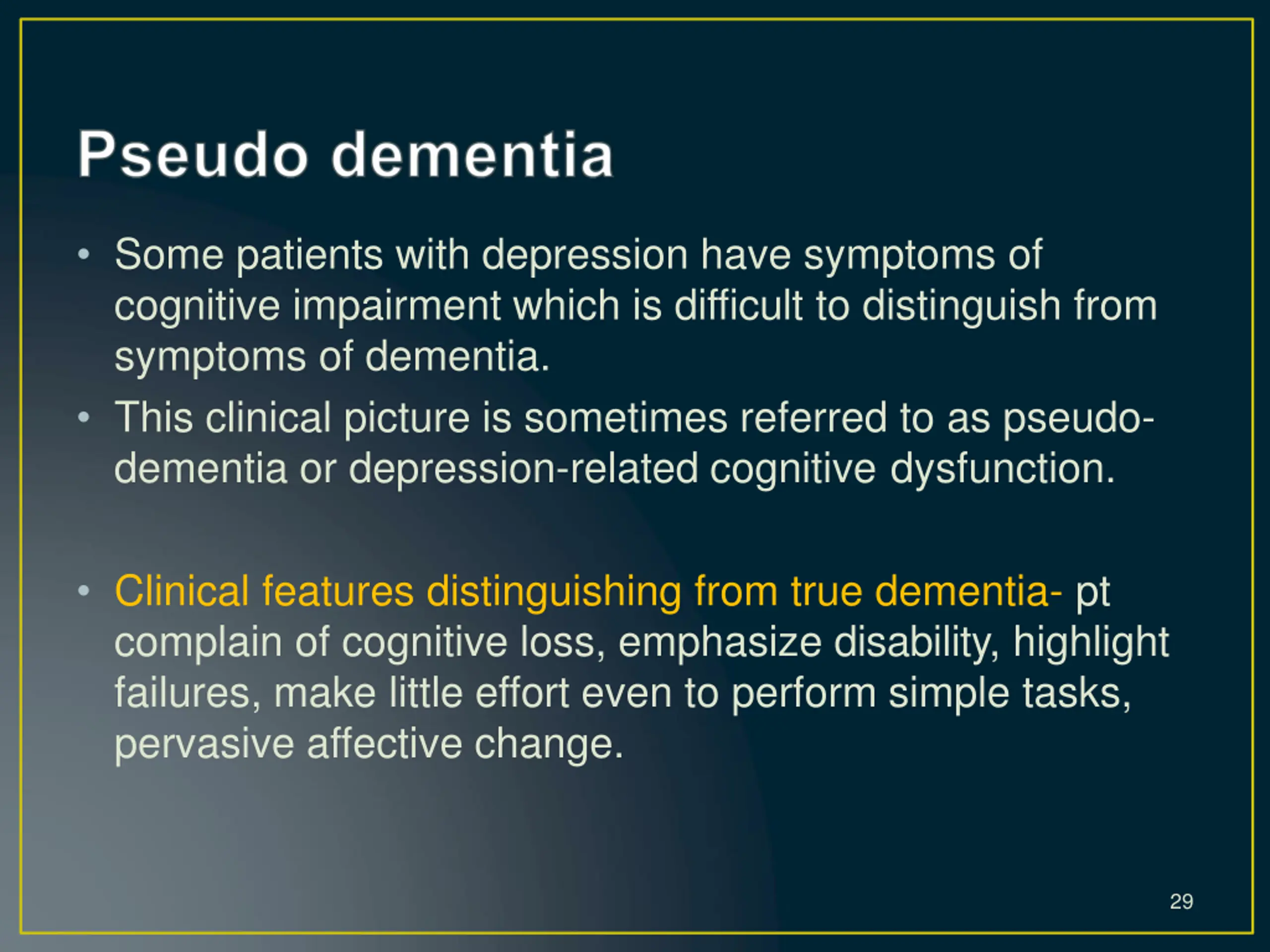 Some patients with depression have symptoms of cognitive impairment which is difficult to distinguish from symptoms of dementia. This clinical picture is sometimes referred to as pseudo- dementia or depression-related cognitive dysfunction. Clinical features distinguishing from true dementia- pt complain of cognitive loss, emphasize disability, highlight failures, make little effort even to perform simple tasks, pervasive affective change. 29