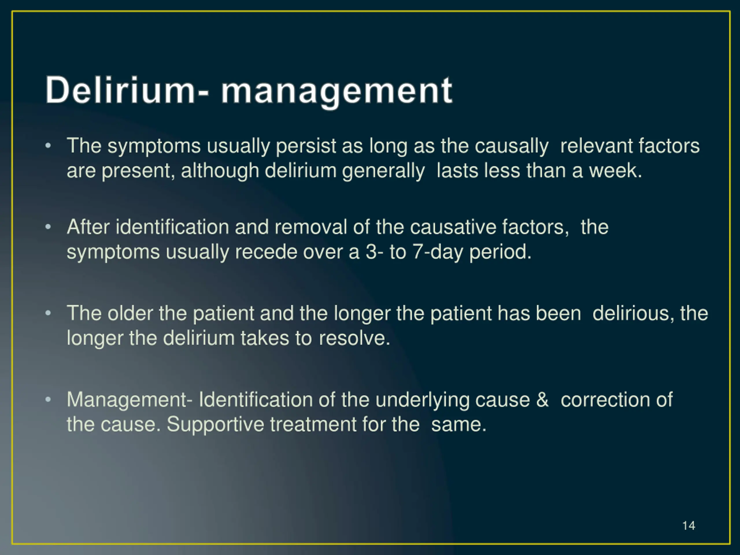 The symptoms usually persist as long as the causally relevant factors are present, although delirium generally lasts less than a week. After identification and removal of the causative factors, the symptoms usually recede over a 3- to 7-day period. The older the patient and the longer the patient has been delirious, the longer the delirium takes to resolve. Management- Identification of the underlying cause & correction of the cause. Supportive treatment for the same. 14