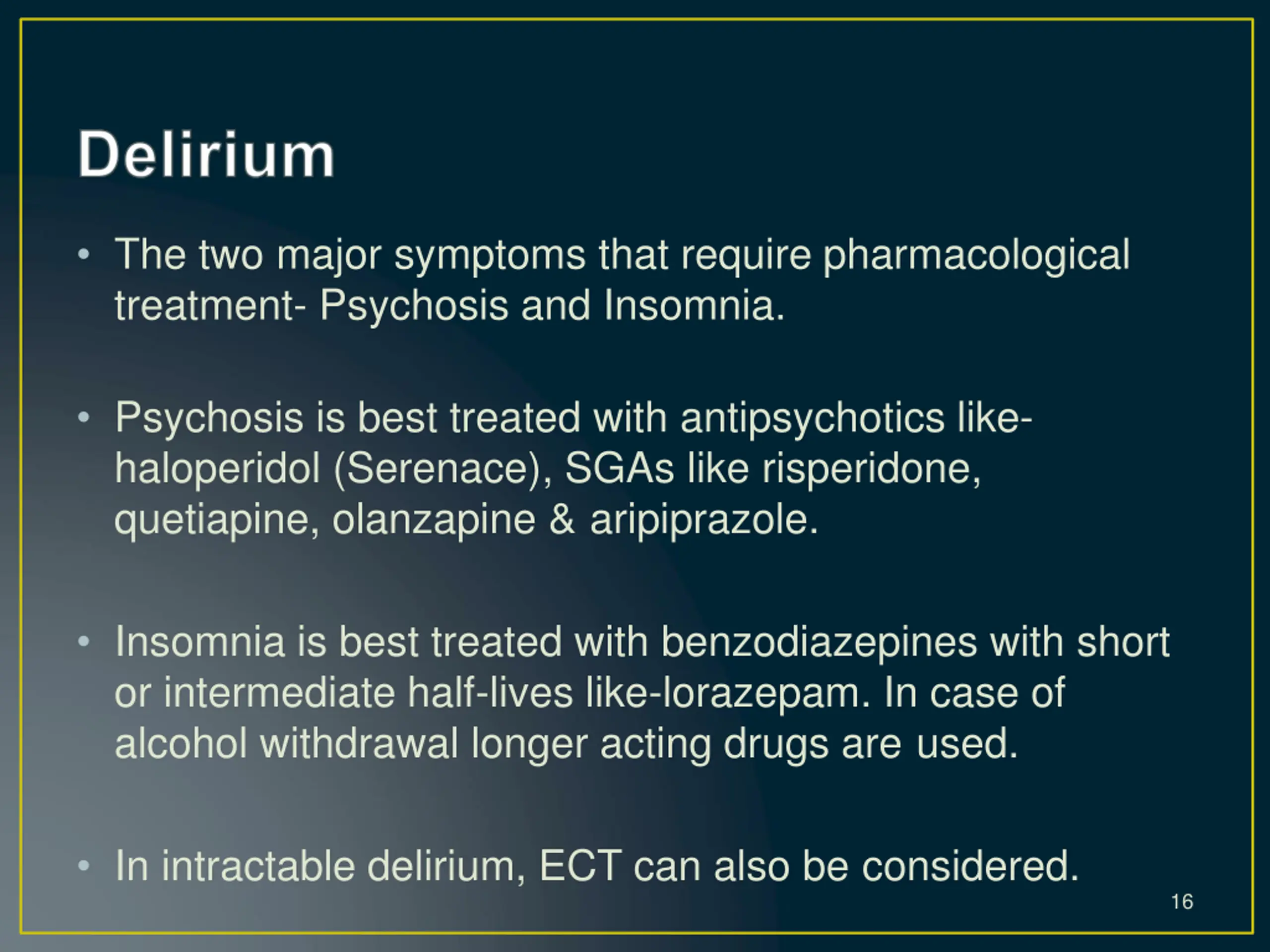The two major symptoms that require pharmacological treatment- Psychosis and Insomnia. Psychosis is best treated with antipsychotics like- haloperidol (Serenace), SGAs like risperidone, quetiapine, olanzapine & aripiprazole. Insomnia is best treated with benzodiazepines with short or intermediate half-lives like-lorazepam. In case of alcohol withdrawal longer acting drugs are used. In intractable delirium, ECT can also be considered. 16
