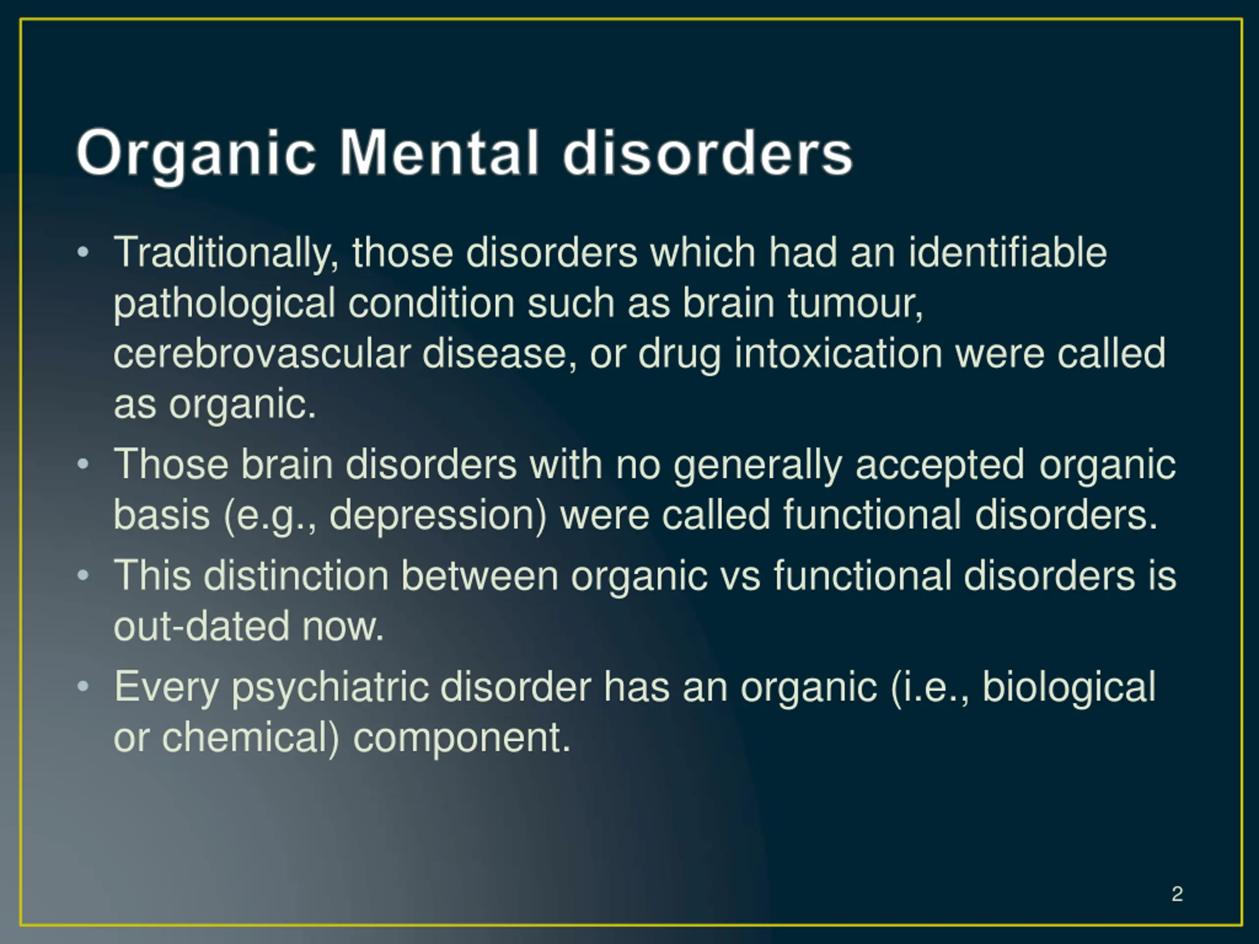 Traditionally, those disorders which had an identifiable pathological condition such as brain tumour, cerebrovascular disease, or drug intoxication were called as organic. Those brain disorders with no generally accepted organic basis (e.g., depression) were called functional disorders. This distinction between organic vs functional disorders is out-dated now. Every psychiatric disorder has an organic (i.e., biological or chemical) component. 2