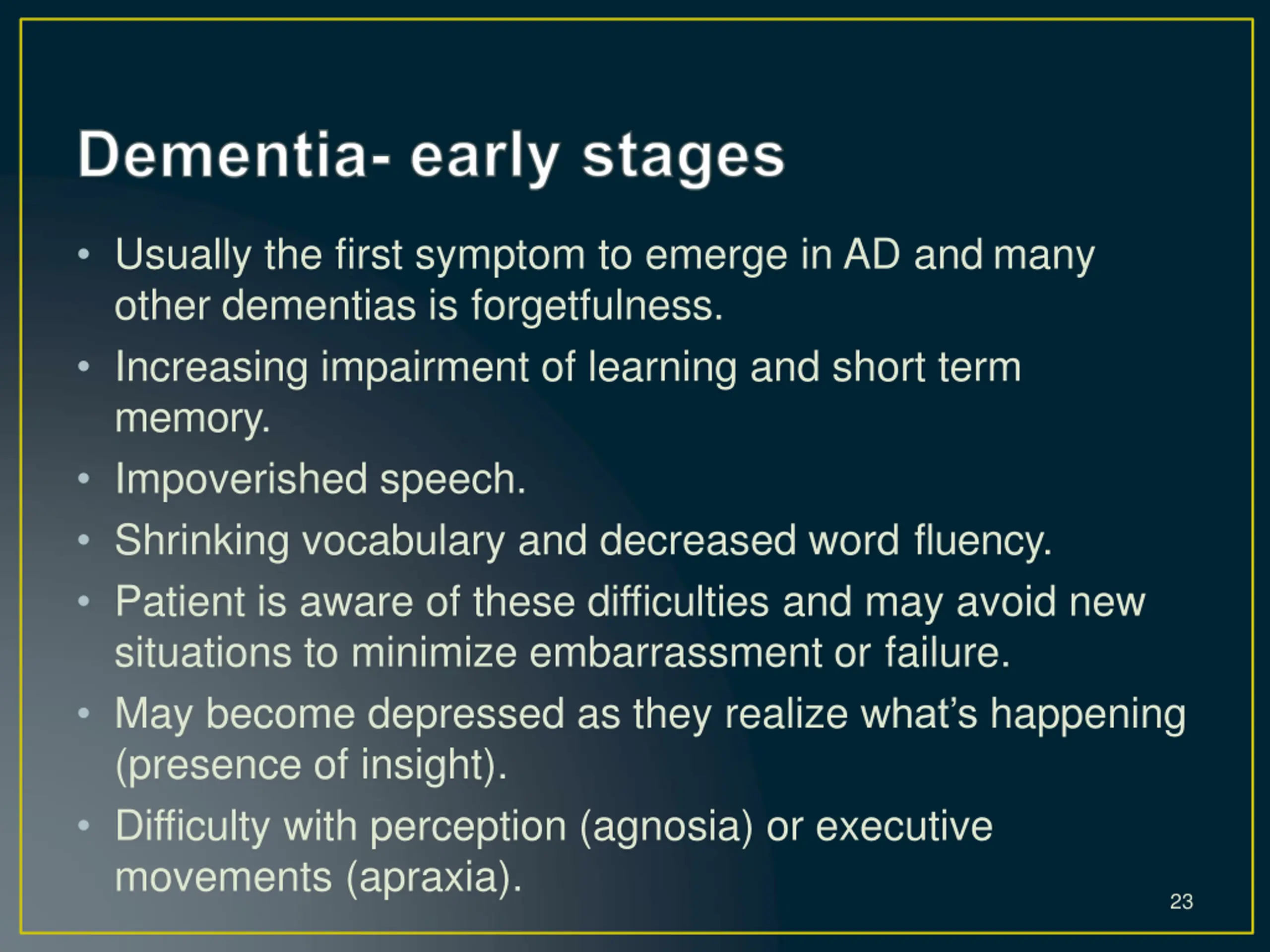 Usually the first symptom to emerge in AD and many other dementias is forgetfulness. Increasing impairment of learning and short term memory. Impoverished speech. Shrinking vocabulary and decreased word fluency. Patient is aware of these difficulties and may avoid new situations to minimize embarrassment or failure. May become depressed as they realize what s happening (presence of insight). Difficulty with perception (agnosia) or executive movements (apraxia). 23