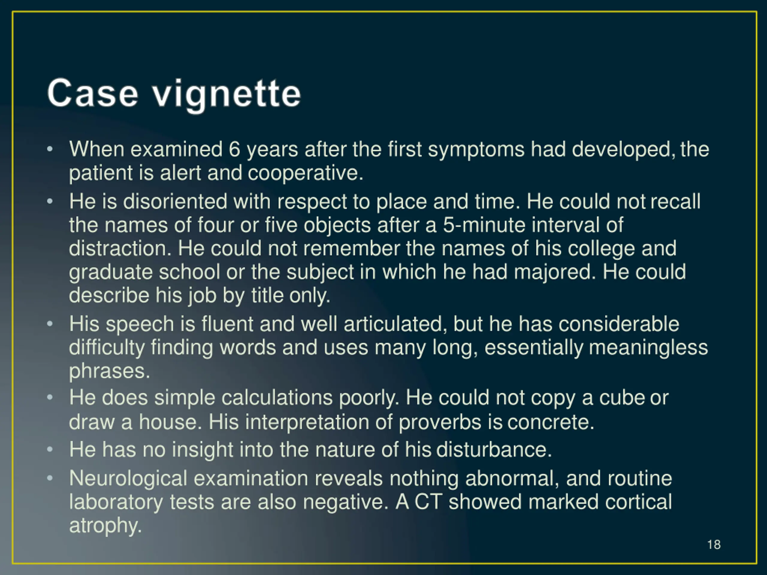 When examined 6 years after the first symptoms had developed,the patient is alert and cooperative. He is disoriented with respect to place and time. He could notrecall the names of four or five objects after a 5-minute interval of distraction. He could not remember the names of his college and graduate school or the subject in which he had majored. He could describe his job by title only. His speech is fluent and well articulated, but he has considerable difficulty finding words and uses many long, essentially meaningless phrases. He does simple calculations poorly. He could not copy a cubeor draw a house. His interpretation of proverbs isconcrete. He has no insight into the nature of his disturbance. Neurological examination reveals nothing abnormal, and routine laboratory tests are also negative. A CT showed marked cortical atrophy. 18