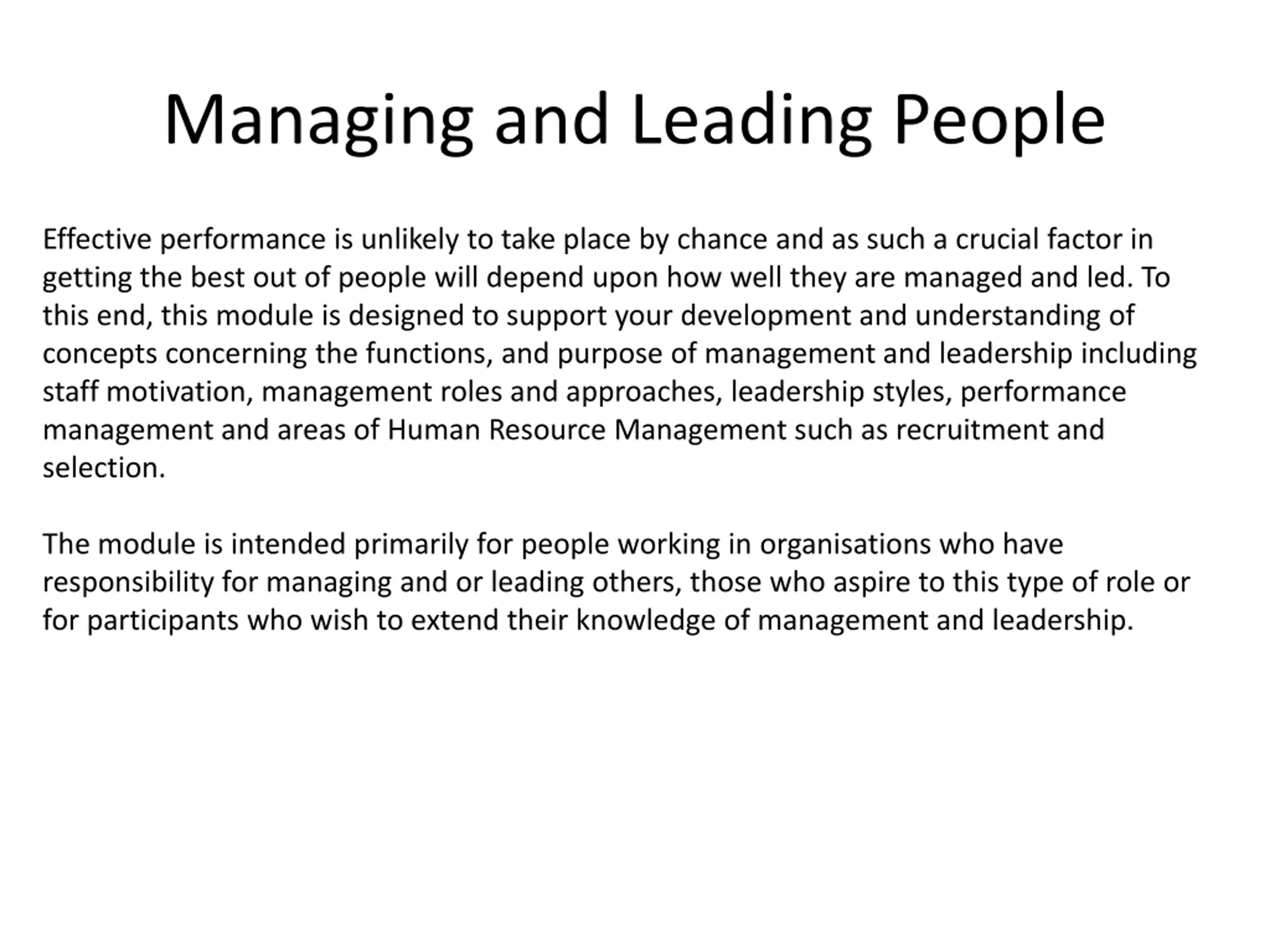 Managing and Leading People Effective performance is unlikely to take place by chance and as such a crucial factor in getting the best out of people will depend upon how well they are managed and led. To this end, this module is designed to support your development and understanding of concepts concerning the functions, and purpose of management and leadership including staff motivation, management roles and approaches, leadership styles, performance management and areas of Human Resource Management such as recruitment and selection. The module is intended primarily for people working in organisations who have responsibility for managing and or leading others, those who aspire to this type of role or for participants who wish to extend their knowledge of management and leadership.