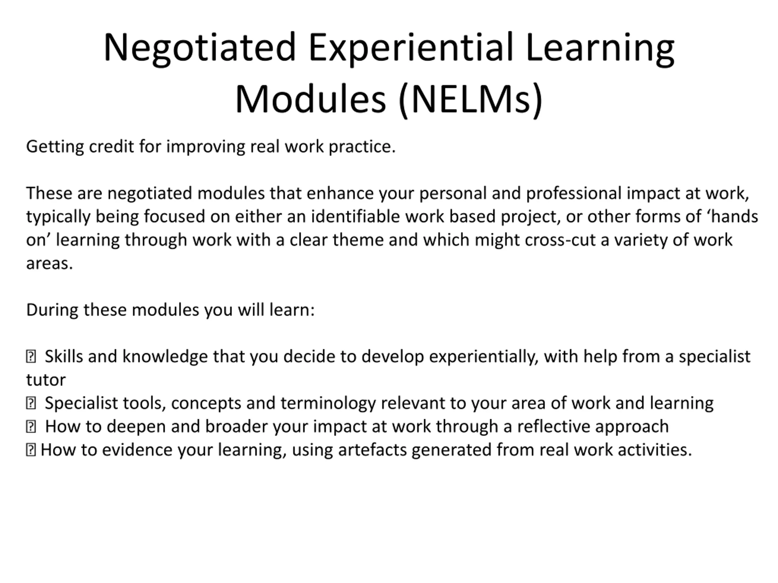 Negotiated Experiential Learning Modules (NELMs) Getting credit for improving real work practice. These are negotiated modules that enhance your personal and professional impact at work, typically being focused on either an identifiable work based project, or other forms of hands on learning through work with a clear theme and which might cross-cut a variety of work areas. During these modules you will learn: Skills and knowledge that you decide to develop experientially, with help from a specialist tutor Specialist tools, concepts and terminology relevant to your area of work and learning How to deepen and broader your impact at work through a reflective approach How to evidence your learning, using artefacts generated from real work activities.