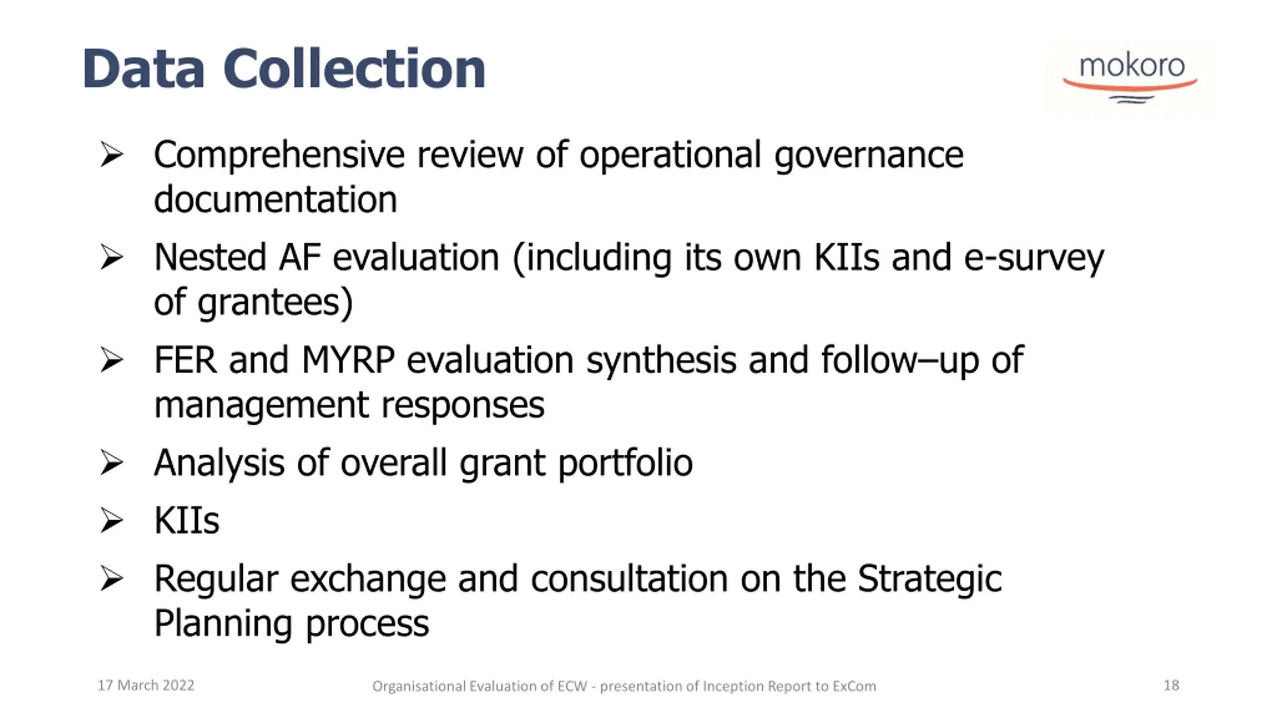 Data Collection Comprehensive review of operational governance documentation Nested AF evaluation (including its own KIIs and e-survey of grantees) FER and MYRP evaluation synthesis and follow up of management responses Analysis of overall grant portfolio KIIs Regular exchange and consultation on the Strategic Planning process 17 March 2022 18 Organisational Evaluation of ECW - presentation of Inception Report to ExCom