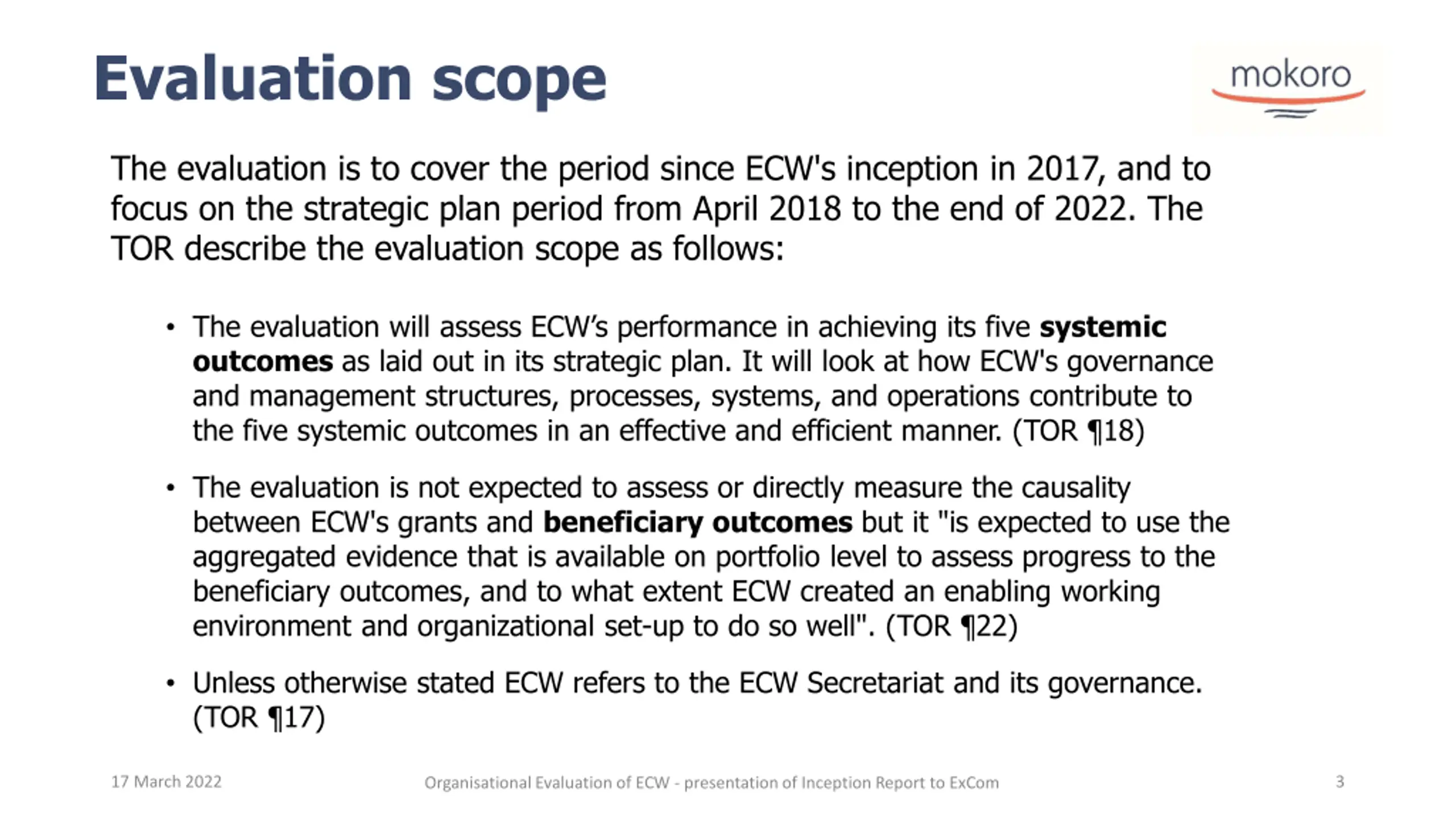 Evaluation scope The evaluation is to cover the period since ECW's inception in 2017, and to focus on the strategic plan period from April 2018 to the end of 2022. The TOR describe the evaluation scope as follows: The evaluation will assess ECW s performance in achieving its five systemic outcomes as laid out in its strategic plan.It will look at how ECW's governance and management structures, processes, systems, and operations contribute to the five systemic outcomes in an effective and efficient manner. (TOR 18) The evaluation is not expected to assess or directly measure the causality between ECW's grants and beneficiary outcomes but it "is expected to use the aggregated evidence that is available on portfolio level to assess progress to the beneficiary outcomes, and to what extent ECW created an enabling working environment and organizational set-up to do so well". (TOR 22) Unless otherwise stated ECW refers to the ECW Secretariat and its governance. (TOR 17) 17 March 2022 3 Organisational Evaluation of ECW - presentation of Inception Report to ExCom