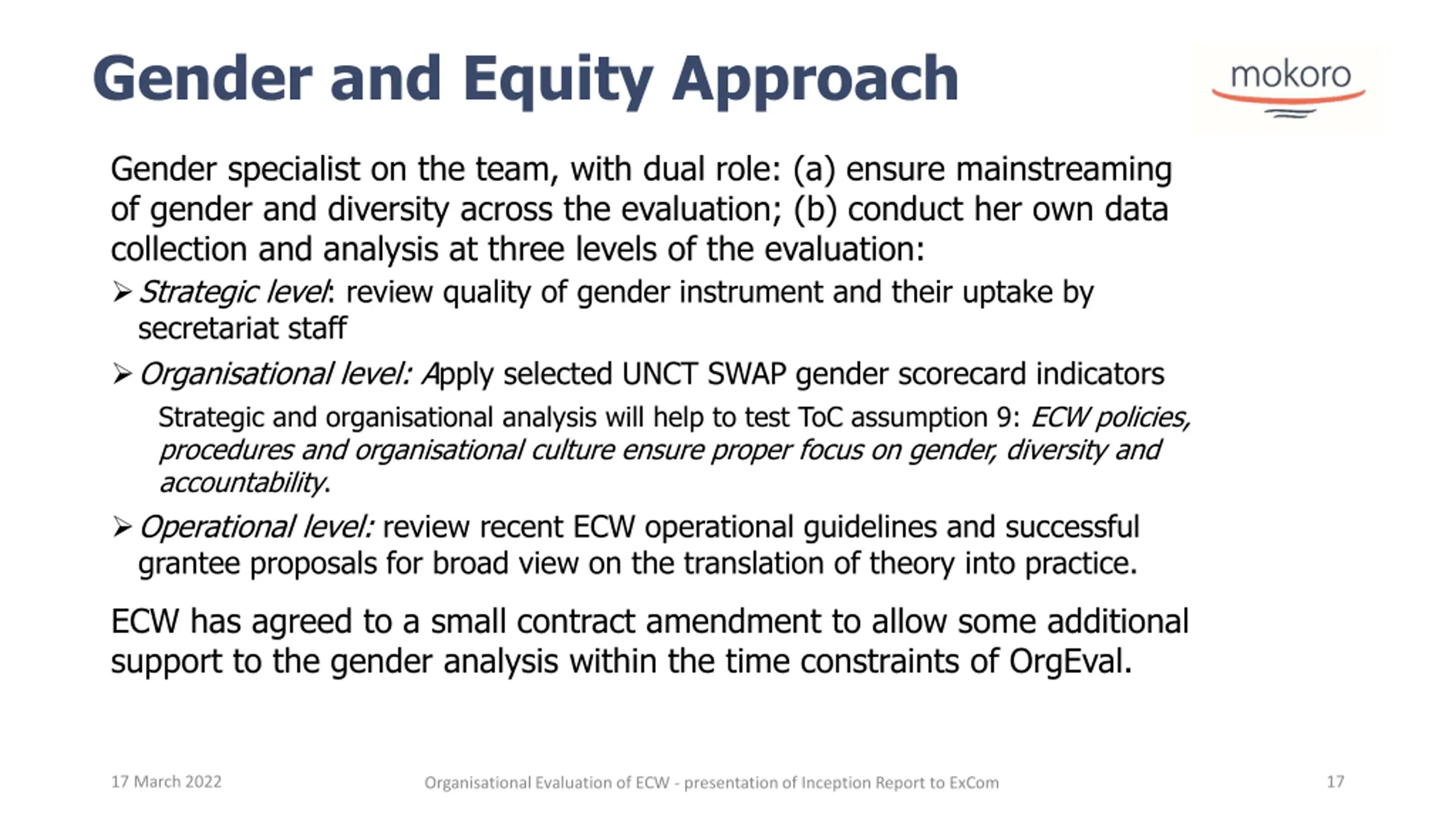 Gender and Equity Approach Gender specialist on the team, with dual role: (a) ensure mainstreaming of gender and diversity across the evaluation; (b) conduct her own data collection and analysis at three levels of the evaluation: Strategic level: review quality of gender instrument and their uptake by secretariat staff Organisational level: Apply selected UNCT SWAP gender scorecard indicators Strategic and organisational analysis will help to test ToC assumption 9: ECW policies, procedures and organisational culture ensure proper focus on gender, diversity and accountability. Operational level: review recent ECW operational guidelines and successful grantee proposals for broad view on the translation of theory into practice. ECW has agreed to a small contract amendment to allow some additional support to the gender analysis within the time constraints of OrgEval. 17 March 2022 17 Organisational Evaluation of ECW - presentation of Inception Report to ExCom