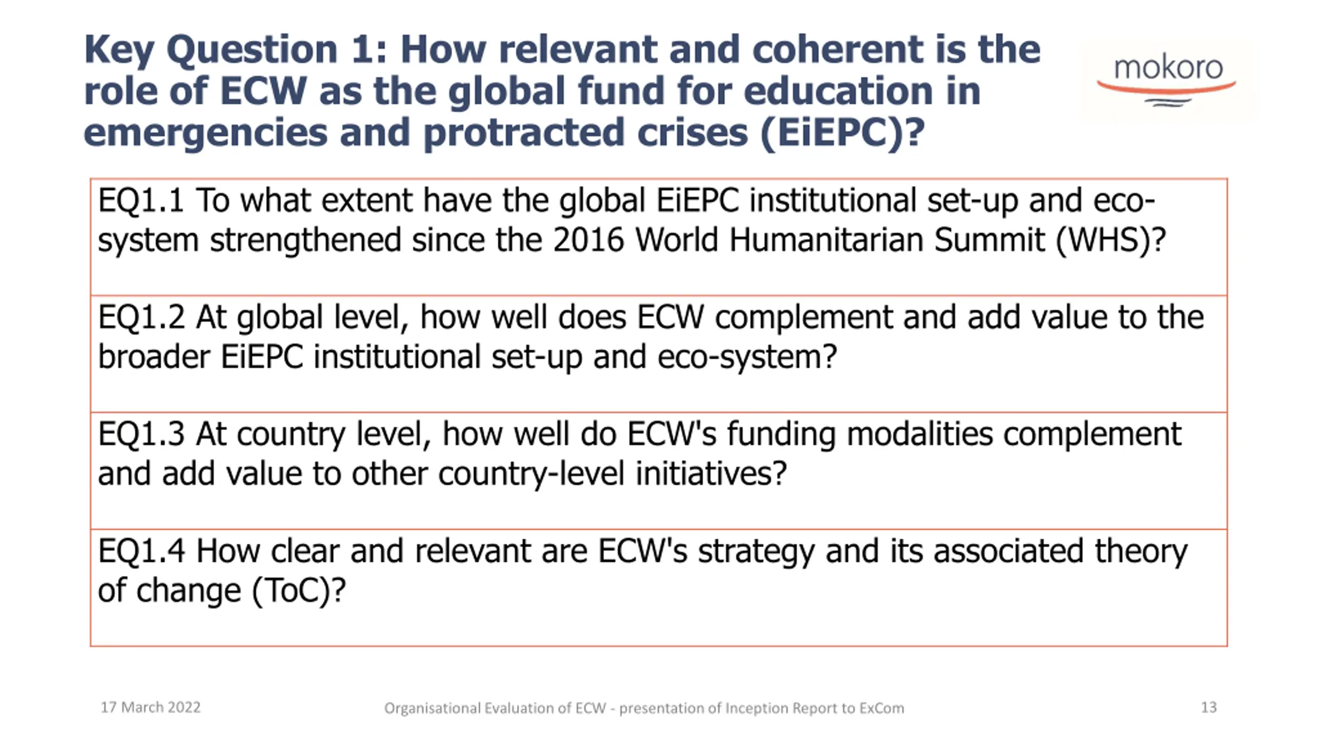 Key Question 1: How relevant and coherent is the role of ECW as the global fund for education in emergencies and protracted crises (EiEPC)? EQ1.1 To what extent have the global EiEPC institutional set-up and eco- system strengthened since the 2016 World Humanitarian Summit (WHS)? EQ1.2 At global level, how well does ECW complement and add value to the broader EiEPC institutional set-up and eco-system? EQ1.3 At country level, how well do ECW's funding modalities complement and add value to other country-level initiatives? EQ1.4 How clear and relevant are ECW's strategy and its associated theory of change (ToC)? 17 March 2022 13 Organisational Evaluation of ECW - presentation of Inception Report to ExCom