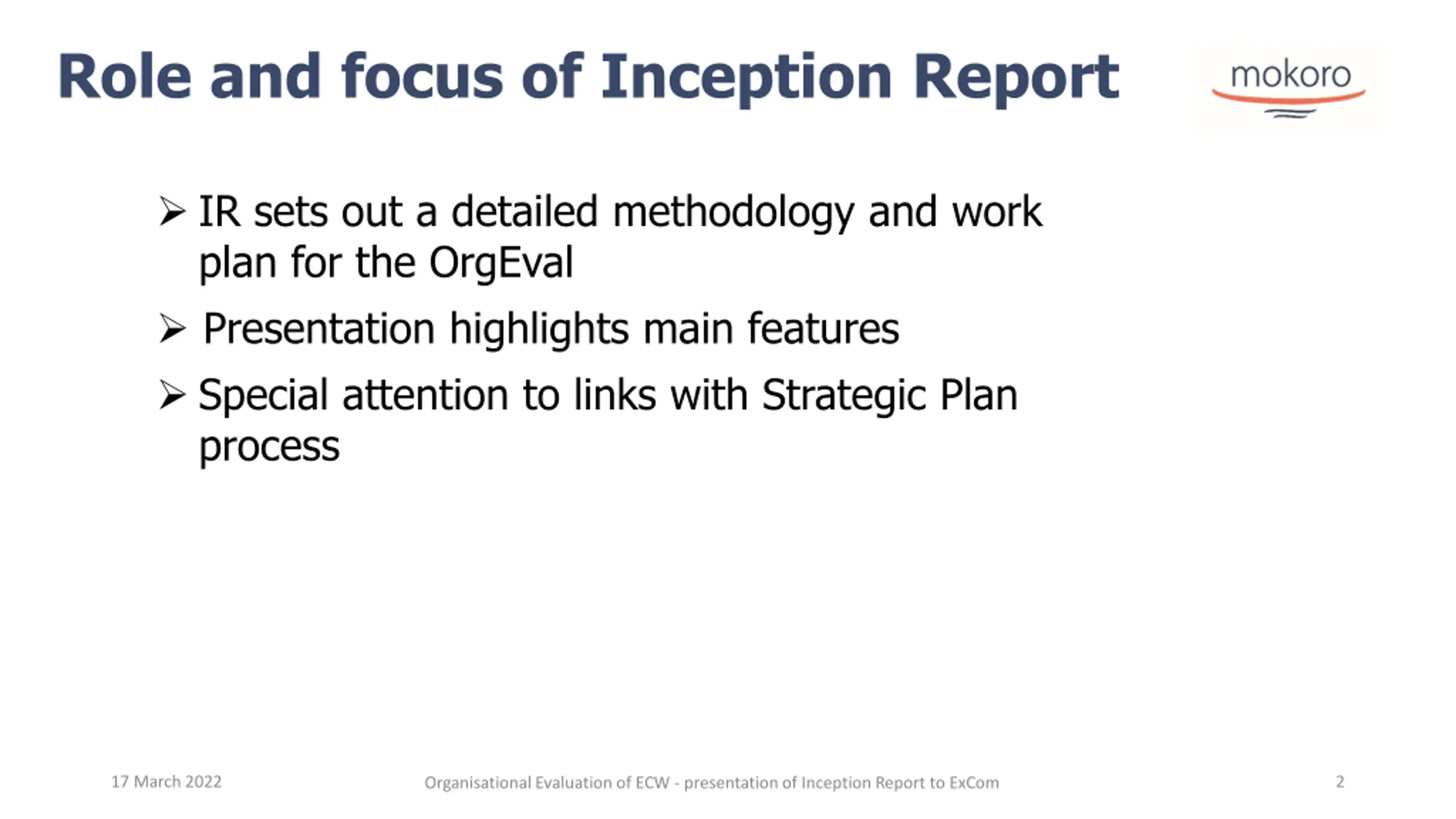 Organisational Fitness Framework 17 March 2022 8 Organisational Evaluation of ECW - presentation of Inception Report to ExCom