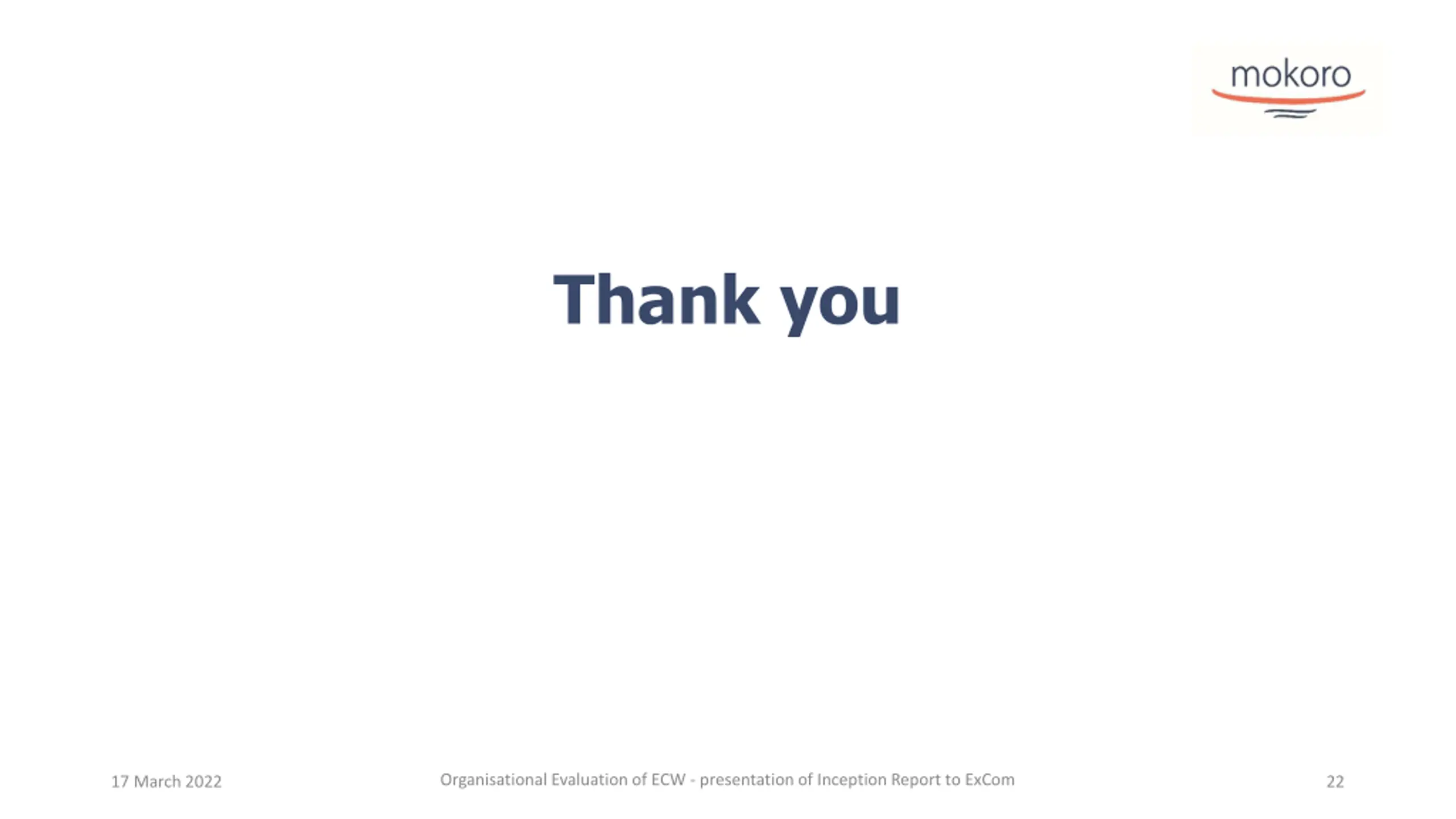 Thank you Organisational Evaluation of ECW - presentation of Inception Report to ExCom 17 March 2022 22