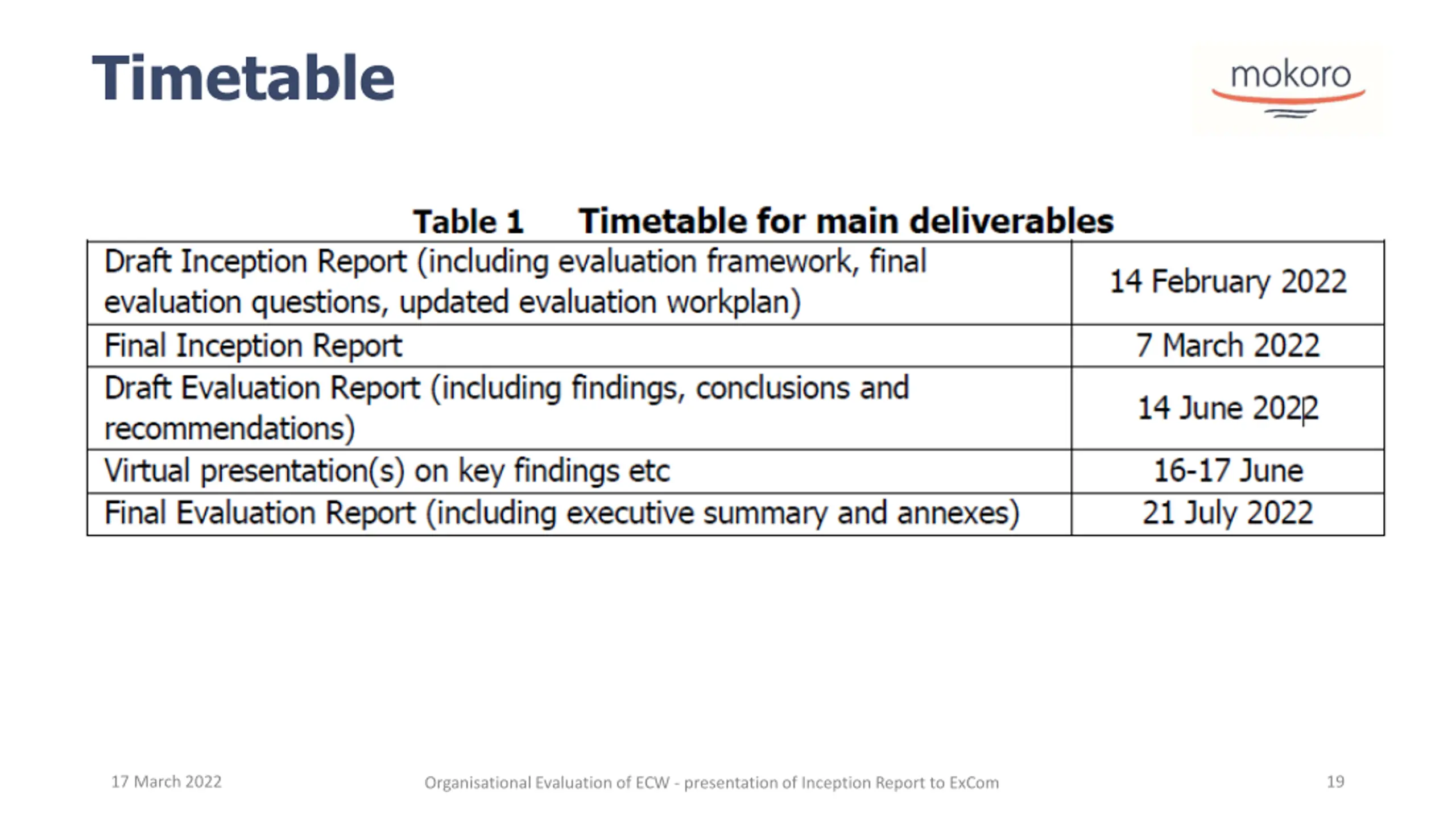 Timetable 17 March 2022 19 Organisational Evaluation of ECW - presentation of Inception Report to ExCom