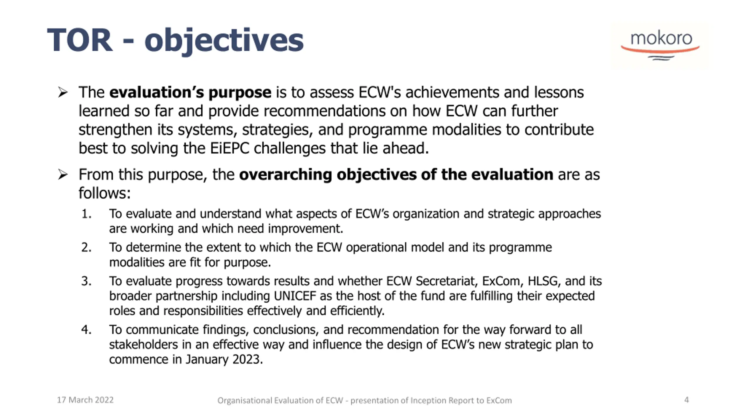 TOR - objectives The evaluation s purpose is to assess ECW's achievements and lessons learned so far and provide recommendations on how ECW can further strengthen its systems, strategies, and programme modalities to contribute best to solving the EiEPC challenges that lie ahead. From this purpose, the overarching objectives of the evaluation are as follows: 1. To evaluate and understand what aspects of ECW s organization and strategic approaches are working and which need improvement. 2. To determine the extent to which the ECW operational model and its programme modalities are fit for purpose. 3. To evaluate progress towards results and whether ECW Secretariat, ExCom, HLSG, and its broader partnership including UNICEF as the host of the fund are fulfilling their expected roles and responsibilities effectively and efficiently. 4. To communicate findings, conclusions, and recommendation for the way forward to all stakeholders in an effective way and influence the design of ECW s new strategic plan to commence in January 2023. 17 March 2022 4 Organisational Evaluation of ECW - presentation of Inception Report to ExCom