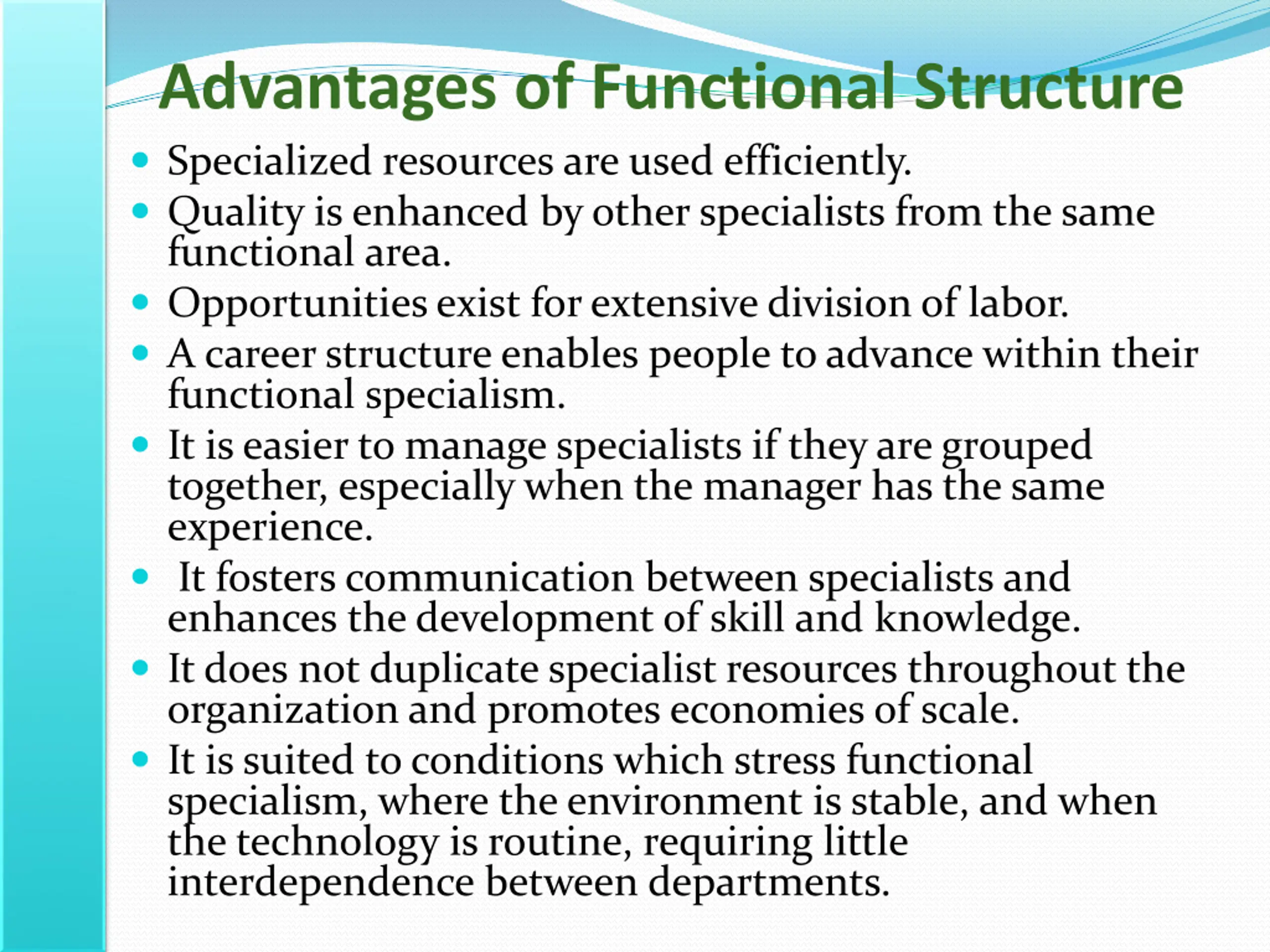 Advantages of Functional Structure Specialized resources are used efficiently. Quality is enhanced by other specialists from the same functional area. Opportunities exist for extensive division of labor. A career structure enables people to advance within their functional specialism. It is easier to manage specialists if they are grouped together, especially when the manager has the same experience. It fosters communication between specialists and enhances the development of skill and knowledge. It does not duplicate specialist resources throughout the organization and promotes economies of scale. It is suited to conditions which stress functional specialism, where the environment is stable, and when the technology is routine, requiring little interdependence between departments.