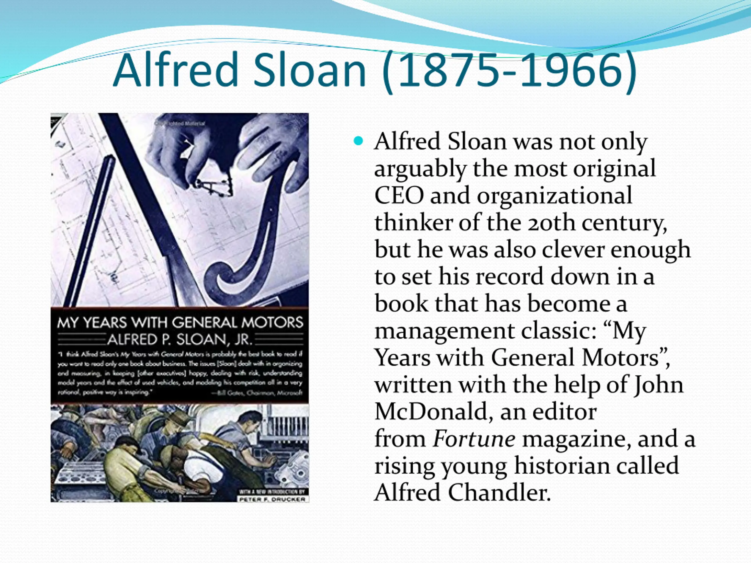 Alfred Sloan (1875-1966) Alfred Sloan was not only arguably the most original CEO and organizational thinker of the 20th century, but he was also clever enough to set his record down in a book that has become a management classic: My Years with General Motors , written with the help of John McDonald, an editor from Fortune magazine, and a rising young historian called Alfred Chandler.