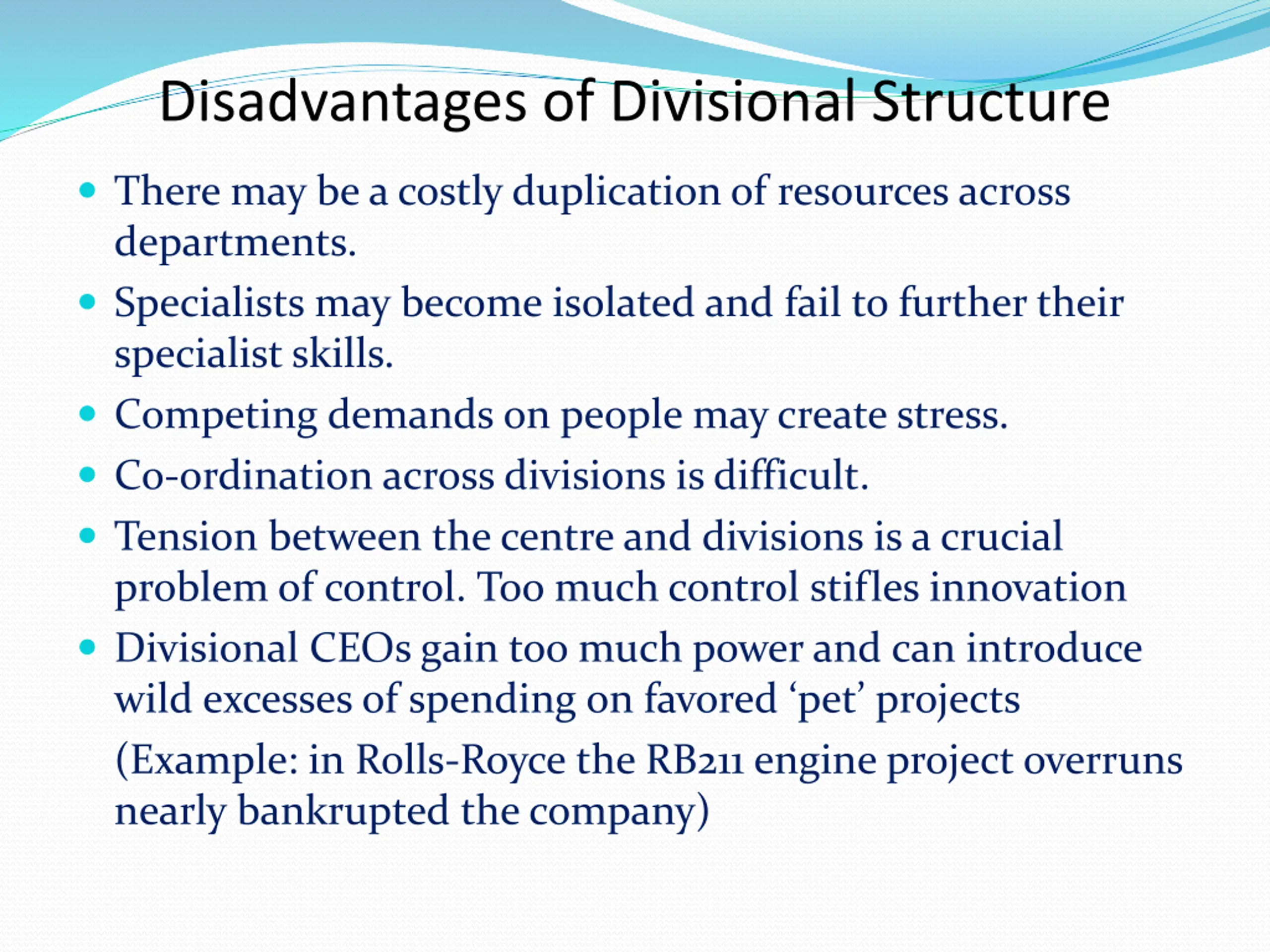Disadvantages of Divisional Structure There may be a costly duplication of resources across departments. Specialists may become isolated and fail to further their specialist skills. Competing demands on people may create stress. Co-ordination across divisions is difficult. Tension between the centre and divisions is a crucial problem of control. Too much control stifles innovation Divisional CEOs gain too much power and can introduce wild excesses of spending on favored pet projects (Example: in Rolls-Royce the RB211 engine project overruns nearly bankrupted the company)