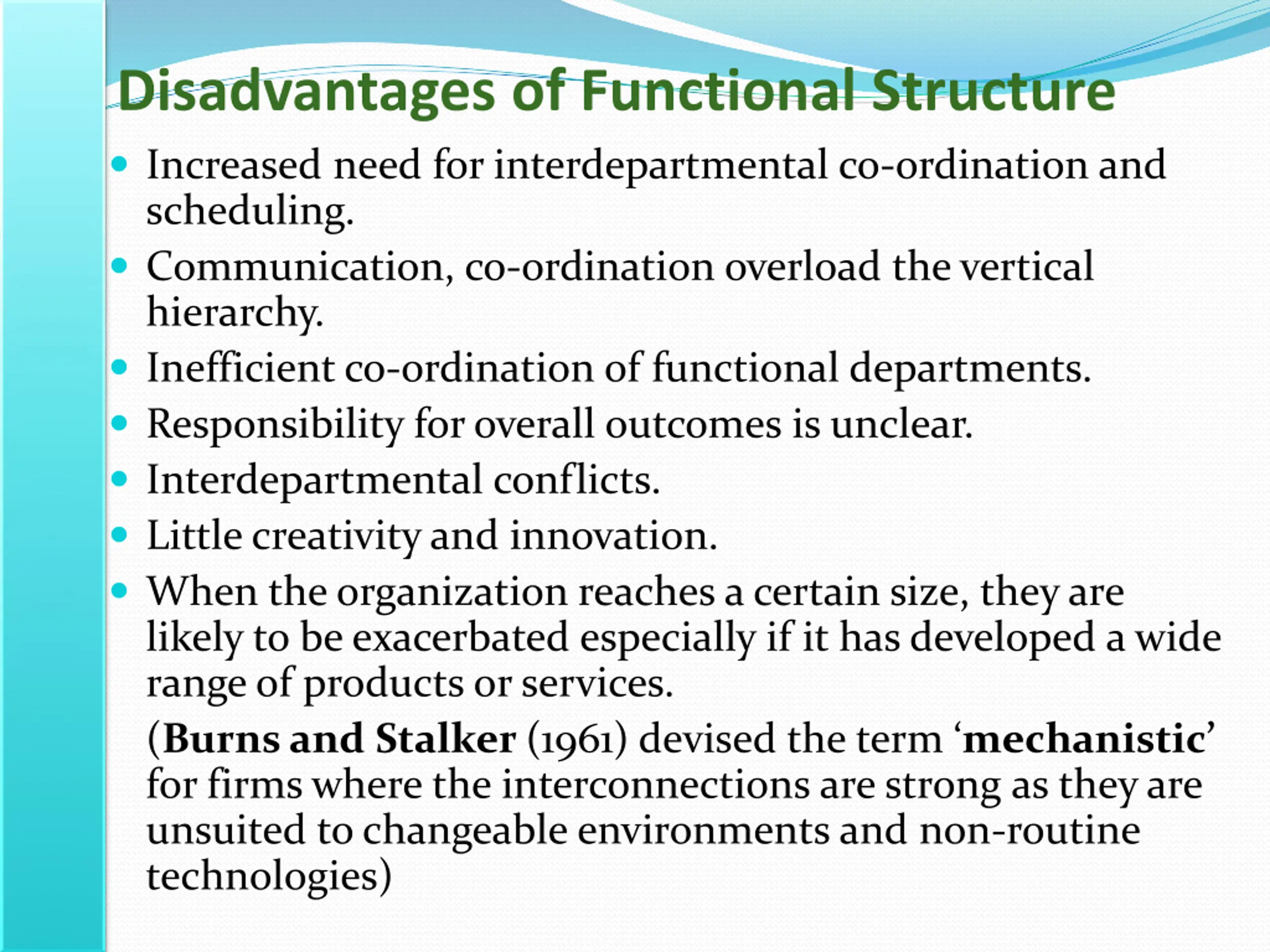 Disadvantages of Functional Structure Increased need for interdepartmental co-ordination and scheduling. Communication, co-ordination overload the vertical hierarchy. Inefficient co-ordination of functional departments. Responsibility for overall outcomes is unclear. Interdepartmental conflicts. Little creativity and innovation. When the organization reaches a certain size, they are likely to be exacerbated especially if it has developed a wide range of products or services. (Burns and Stalker (1961) devised the term mechanistic for firms where the interconnections are strong as they are unsuited to changeable environments and non-routine technologies)