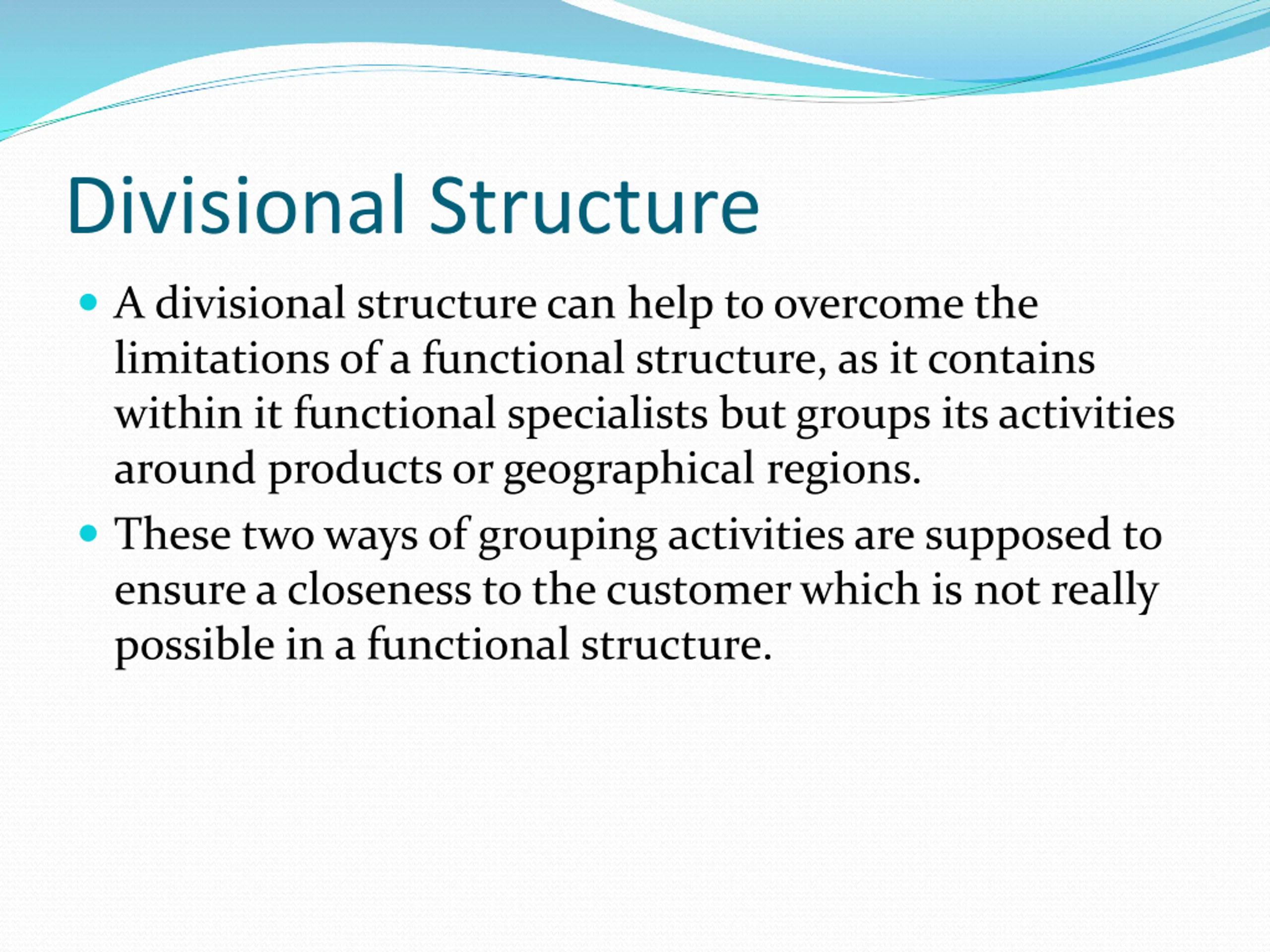 Divisional Structure A divisional structure can help to overcome the limitations of a functional structure, as it contains within it functional specialists but groups its activities around products or geographical regions. These two ways of grouping activities are supposed to ensure a closeness to the customer which is not really possible in a functional structure.