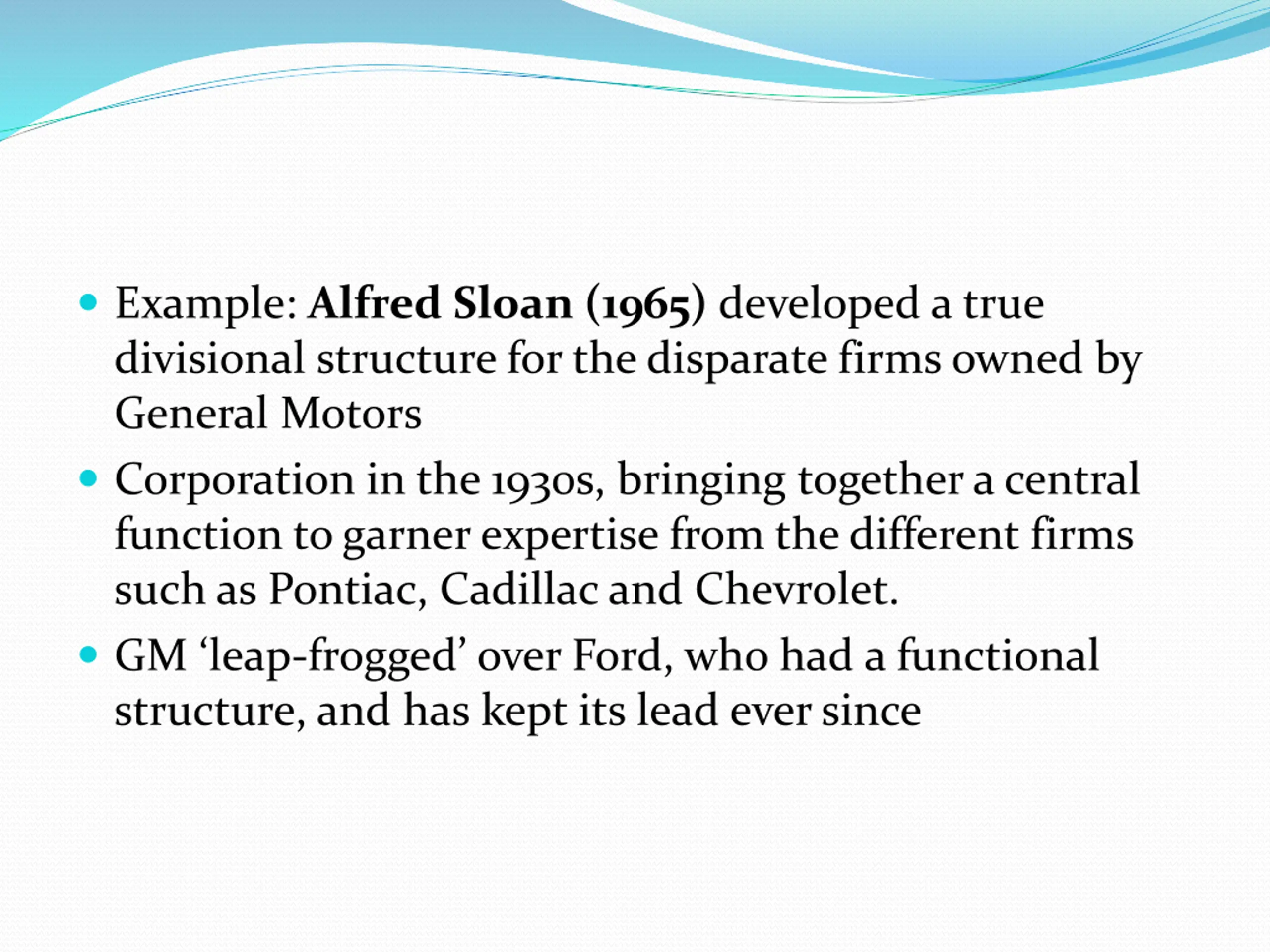 Example: Alfred Sloan (1965) developed a true divisional structure for the disparate firms owned by General Motors Corporation in the 1930s, bringing together a central function to garner expertise from the different firms such as Pontiac, Cadillac and Chevrolet. GM leap-frogged over Ford, who had a functional structure, and has kept its lead ever since