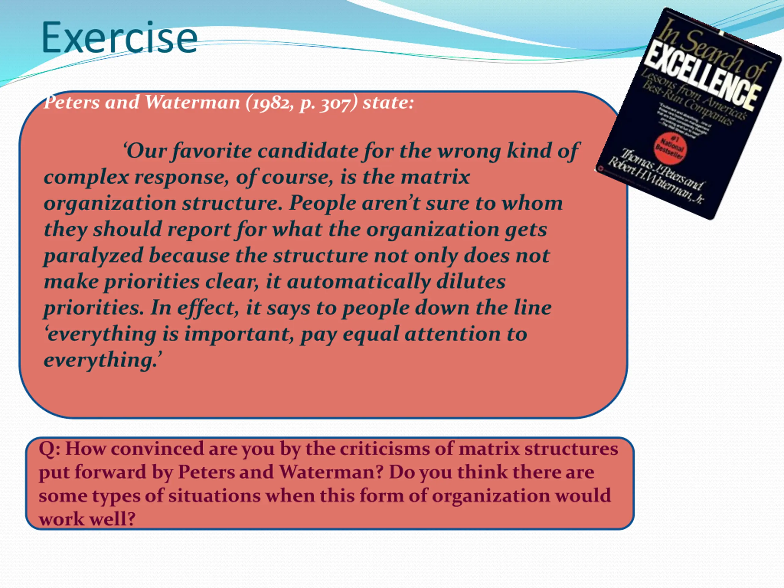 Exercise Peters and Waterman (1982, p. 307) state: Our favorite candidate for the wrong kind of complex response, of course, is the matrix organization structure. People aren t sure to whom they should report for what the organization gets paralyzed because the structure not only does not make priorities clear, it automatically dilutes priorities. In effect, it says to people down the line everything is important, pay equal attention to everything. Q: How convinced are you by the criticisms of matrix structures put forward by Peters and Waterman? Do you think there are some types of situations when this form of organization would work well?
